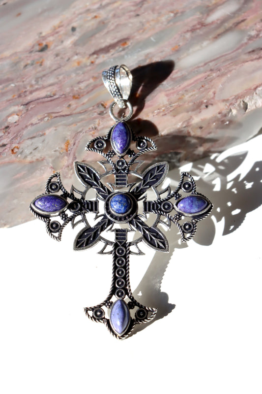 Přívěsek kříže s květinovým motivem a vloženými kameny lapisu lazuli.