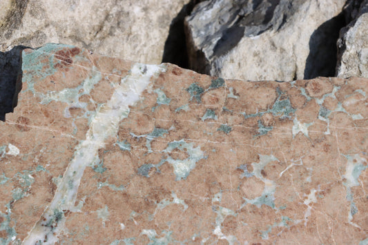 SlevaBludovit s žílou prehnitu kalcitu a záhnědy