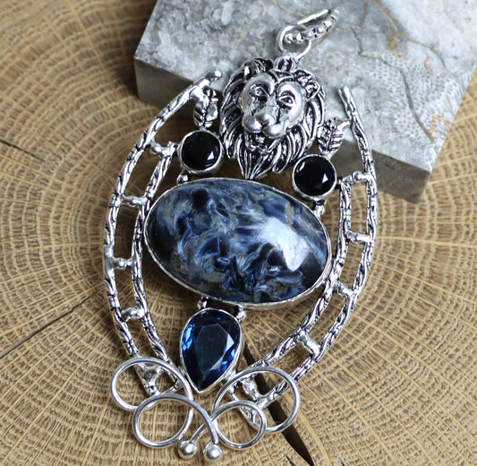 SlevaPřívěšek lev pietersite modrý topaz onyx
