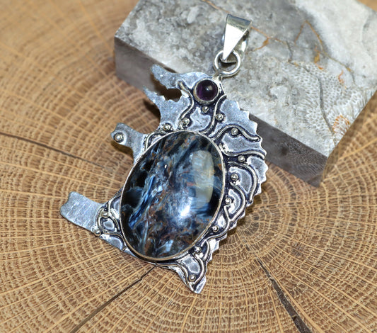 Rozměry: 3×2cm (pietersite); 0.5×0.5cm (ametyst)