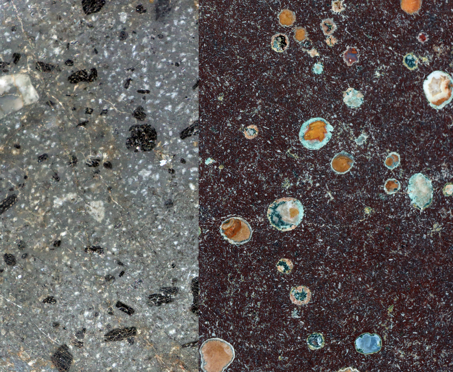 Acháty v melafýru – dutiny v sopečných melafyrech (bazaltech) bývají vyplněny páskovaným chalcedonem, křemenem a kalcitem. Vznikly postupným ukládáním křemičitých roztoků do puklin a dutin vyvřelé horniny. Typická je jemná páskovanost achátů v odstínech šedé, hnědé, červené až oranžové, modré...