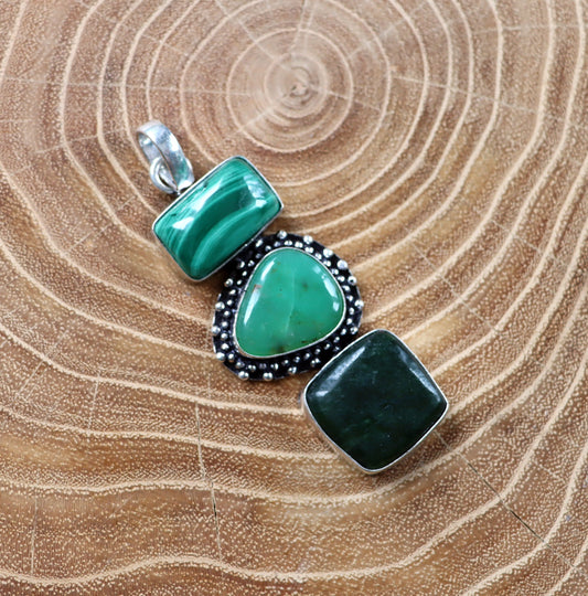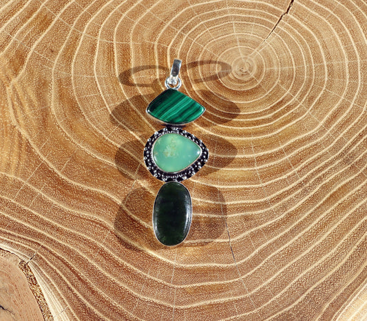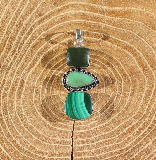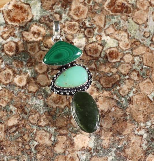 Malachit je známý jako kámen ochrany, který absorbuje negativní energii a podporuje emocionální léčení. Chryzopras přináší vnitřní klid a pomáhá zbavit se negativních myšlenek, podporuje také sebevyjádření a komunikaci. Nefrit je kámen čistoty a uklidnění, který přináší harmonii a vyrovnanost. Kombinace těchto tří kamenů v jednom přívěsku vytváří mocnou směsici energií, která podporuje celkovou pohodu, emocionální rovnováhu a duchovní růst. Tento přívěsek je ideální nejen jako módní doplněk, ale i jako nástroj pro podporu osobního rozvoje a léčení.