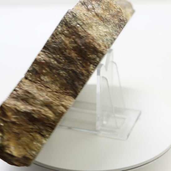 Dekorativní metamorfovaná hornina známá jako svojanovit, charakteristická výraznou foliovanou strukturou a přítomností červenohnědých granátů almandinu. Světlé křemenné žilky a šupinkatá matrix vytvářejí dynamickou kresbu, která odráží deformaci a metamorfní přeměnu horniny během regionálních geologických procesů. Kontrast mezi tmavší foliovanou hmotou a kulovitými granátovými porfyroblasty dodává vzorku osobitý výraz i silný příběh ukrytý v kameni.