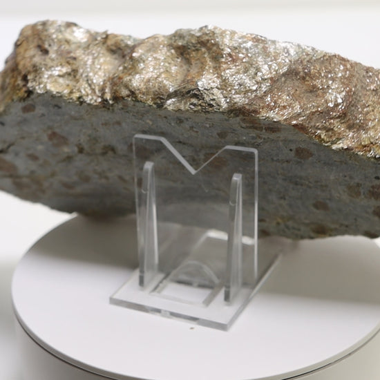 Dekorativní metamorfovaná hornina známá jako svojanovit, charakteristická výraznou foliovanou strukturou a přítomností červenohnědých granátů almandinu. Světlé křemenné žilky a šupinkatá matrix vytvářejí dynamickou kresbu, která odráží deformaci a metamorfní přeměnu horniny během regionálních geologických procesů. Kontrast mezi tmavší foliovanou hmotou a kulovitými granátovými porfyroblasty dodává vzorku osobitý výraz i silný příběh ukrytý v kameni.