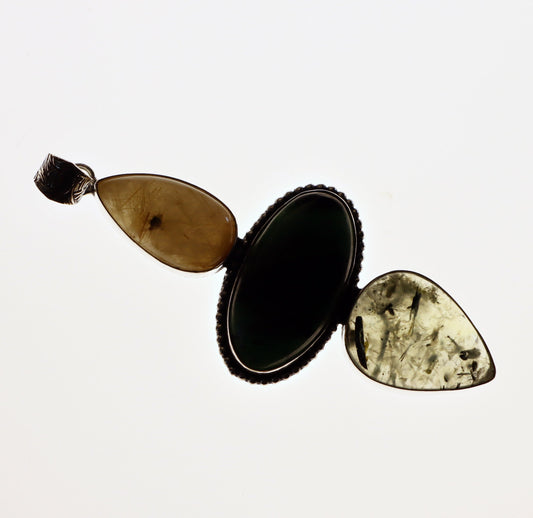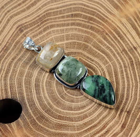 Amulet energie a vitality: Přívěsek Rutil v křišťálu, Rubín v zoisitu & Epidot v prehnitu .Tento přívěsek spojuje tři mocné minerály, které podporují vitalitu, duchovní sílu a fyzické zdraví. Rutil v křišťálu, známý pro své zlaté jehličky uvnitř průzračného křišťálu, zesiluje energii, přináší jasnost a podporuje pozitivní myšlení. Rubín v zoisitu spojuje vášeň a kreativitu s duchovním růstem, přináší životní sílu a podporuje harmonii mezi srdcem a myslí. Epidot v prehnitu, silný kámen léčení, je skvělý pro podporu zdraví plic, napomáhá při vykašlávání a udržuje celkovou rovnováhu v těle. Společně tyto kameny vytvářejí amulet, který posiluje energii, zdraví a duchovní růst.