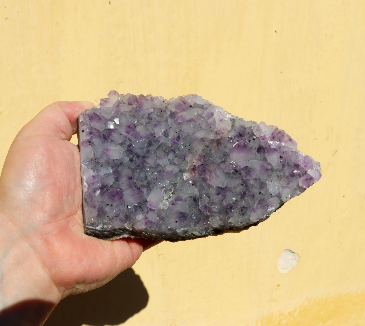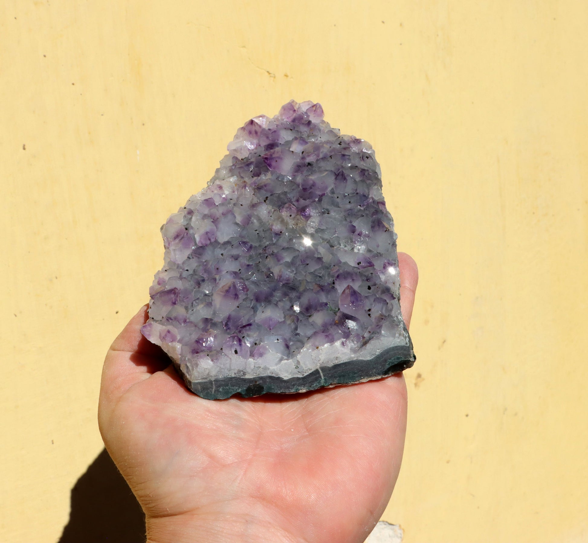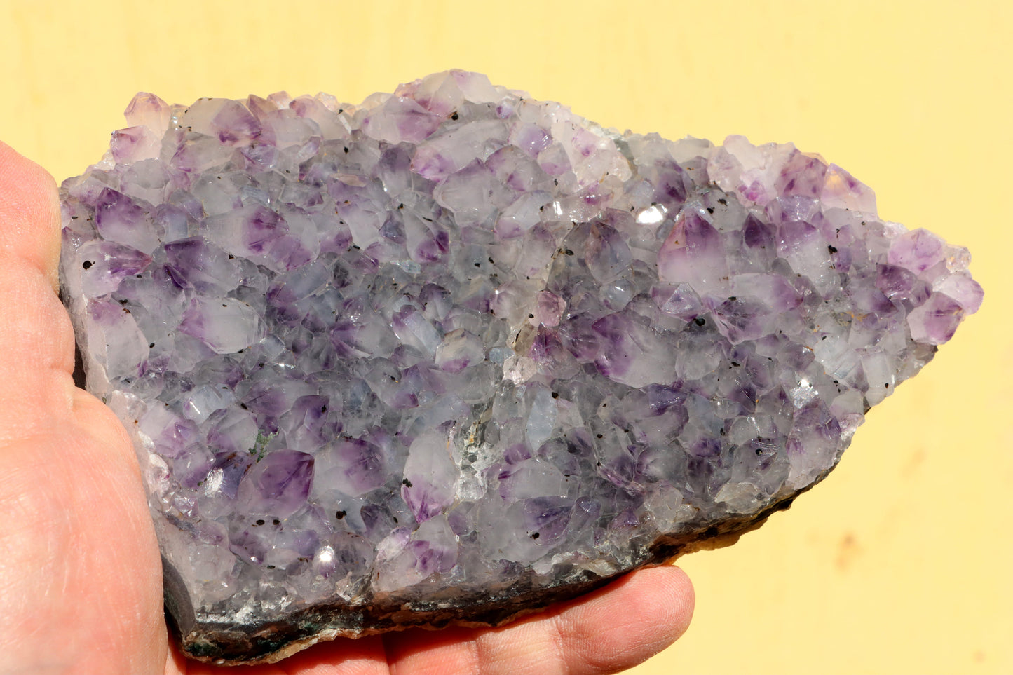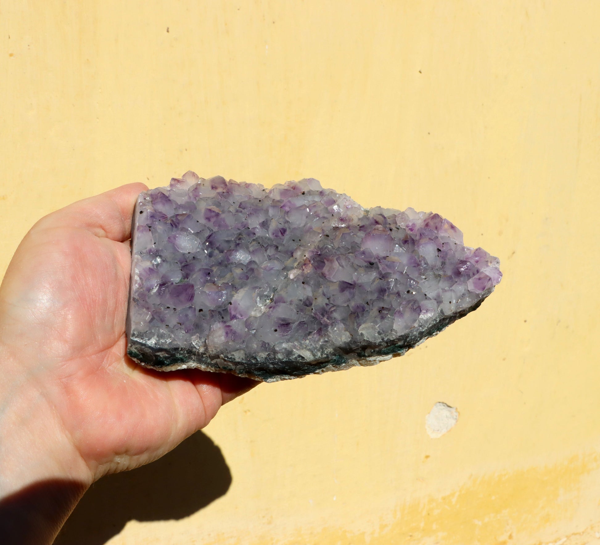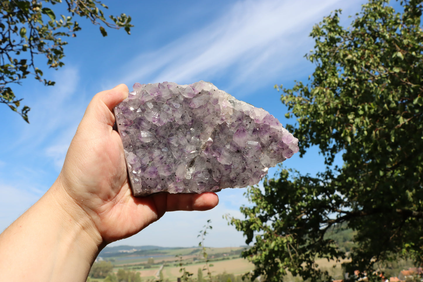 Ametystová drúza s inkluzemi sagenitu. Akorát do ruky.