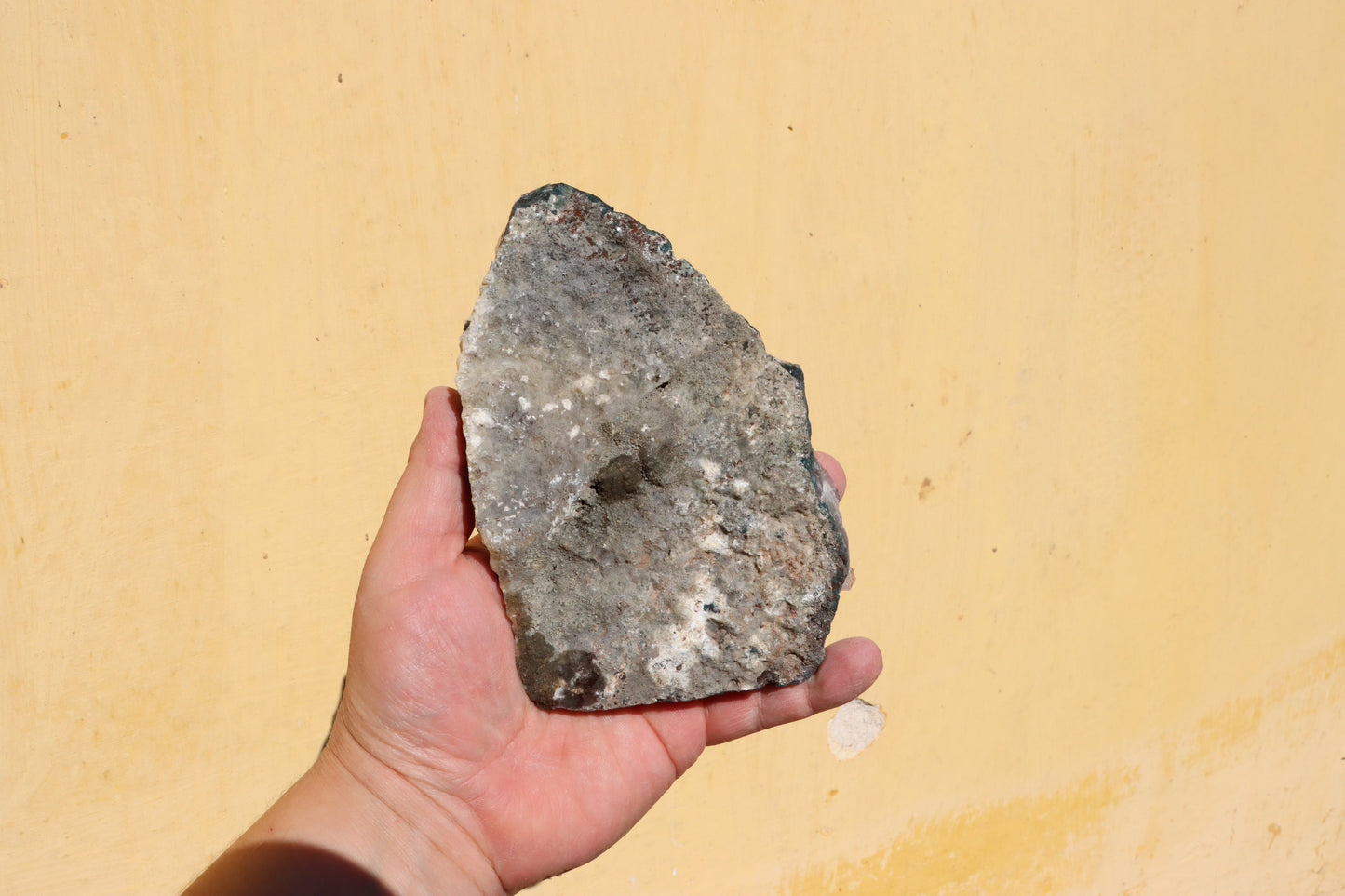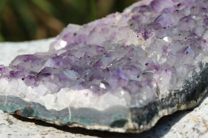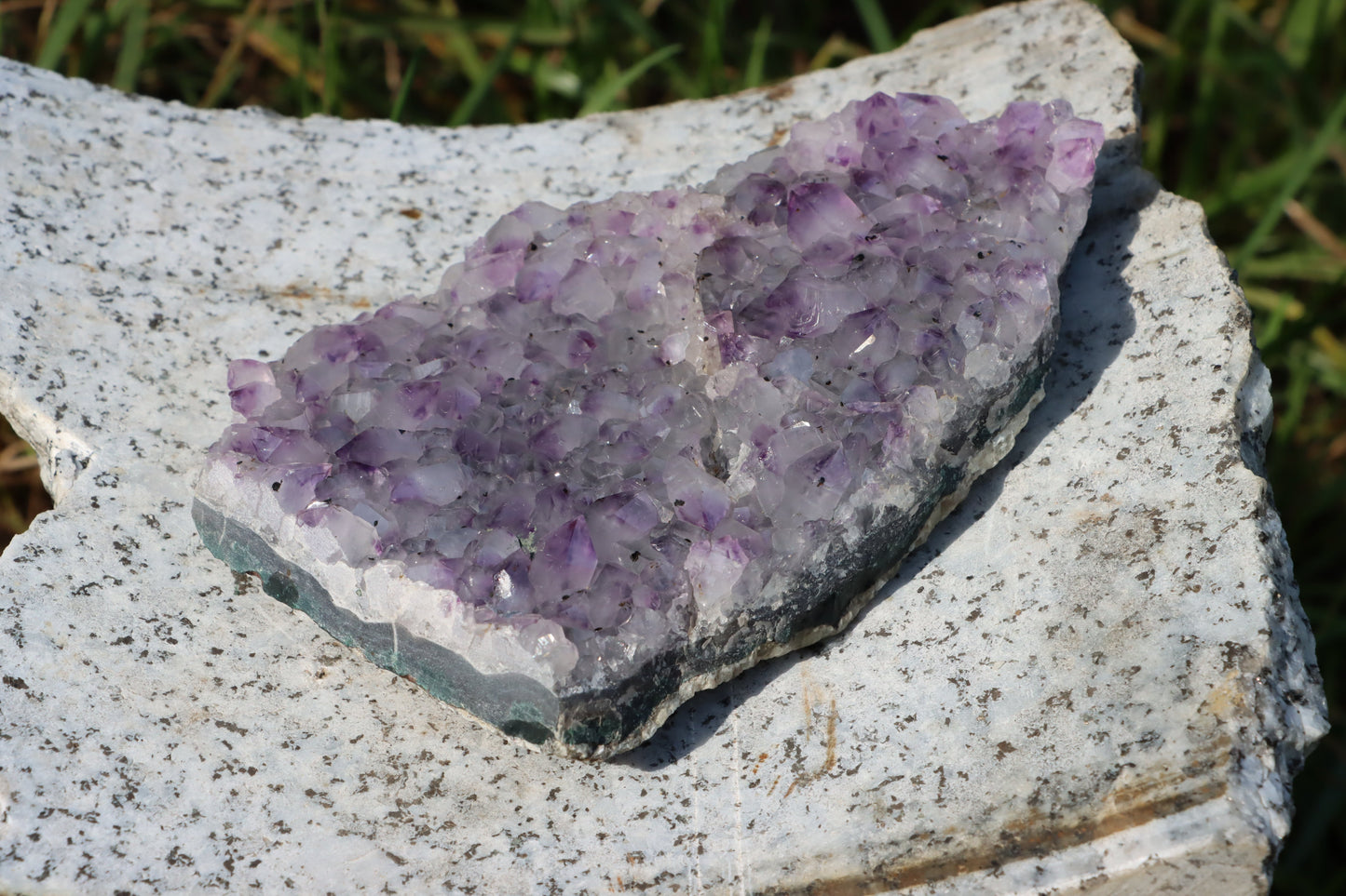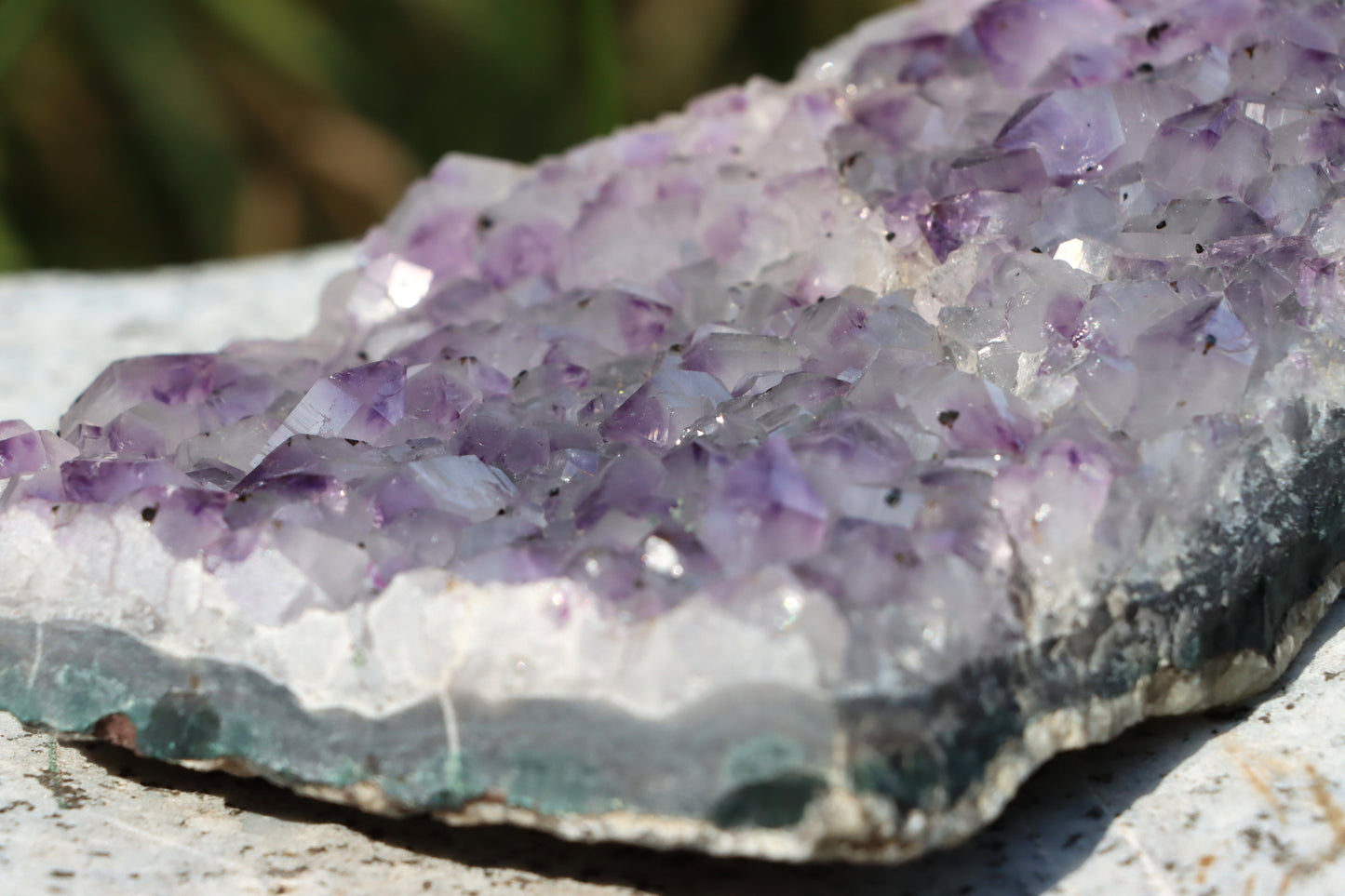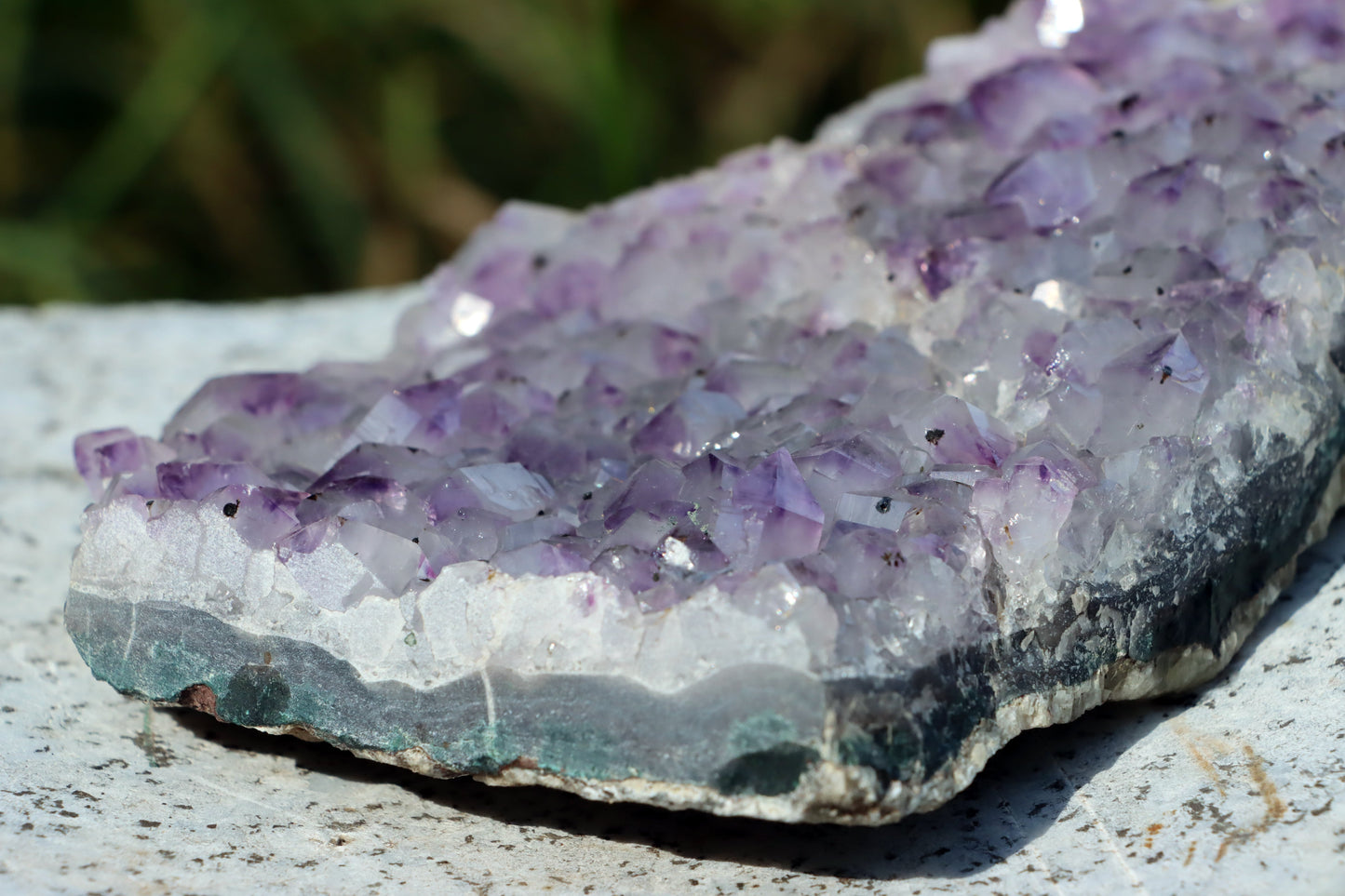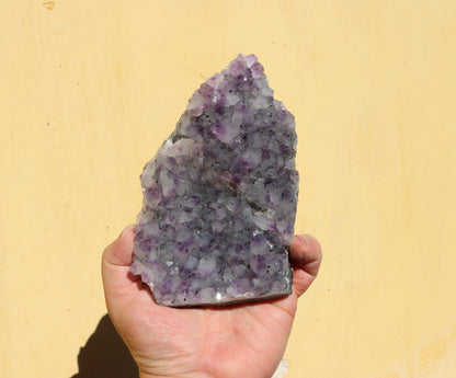Ametystová drúza s inkluzemi sagenitu. Akorát do ruky.