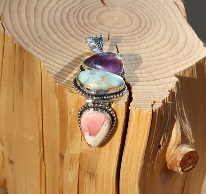 Amulet duchovní harmonie a lásky: Přívěsek z Ametystu, Larimaru a Rodochrozitu. Tento přívěsek spojuje tři krásné minerály, které podporují vnitřní klid, lásku a emocionální rovnováhu. Ametyst, se svými fialovými tóny, přináší duchovní ochranu, podporuje meditaci a zklidňuje mysl. Larimar, s jemně modrými odstíny, je známý jako kámen klidu a komunikace, pomáhá uvolňovat stres a přináší mír do každodenního života. Rodochrozit, s růžovou a červenou barvou, je kamenem lásky a sebeúcty, který podporuje srdeční čakru a emocionální uzdravení. Tato kombinace minerálů vytváří silný amulet pro harmonii, lásku a vnitřní mír.