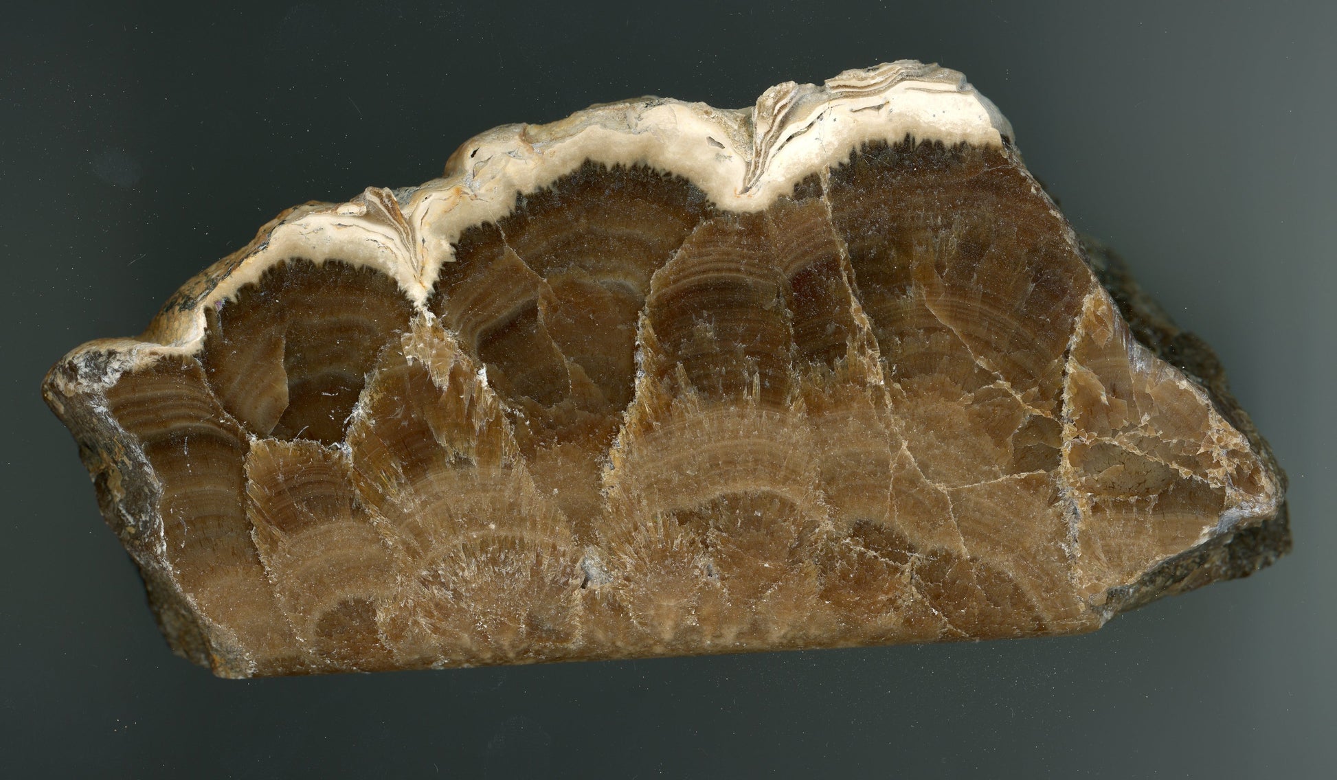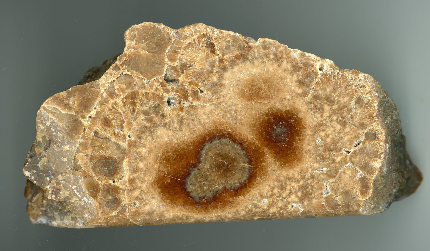 Monument z hnědého vláktnitého aragonitového krápníku zaleštěný ze dvou stran, které spojuje oblina.