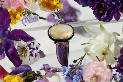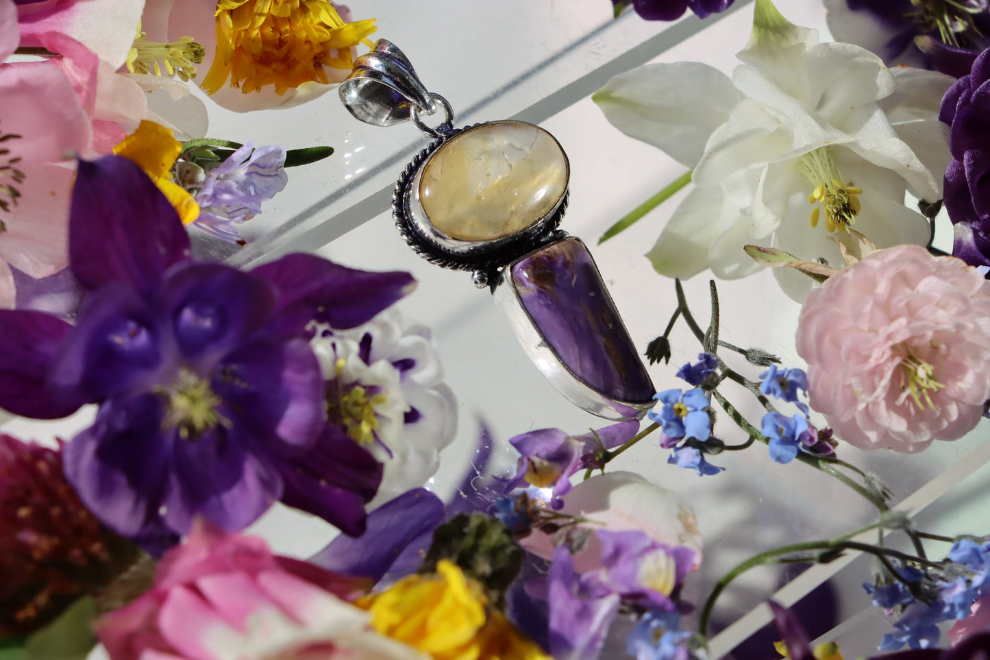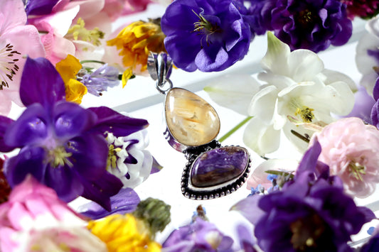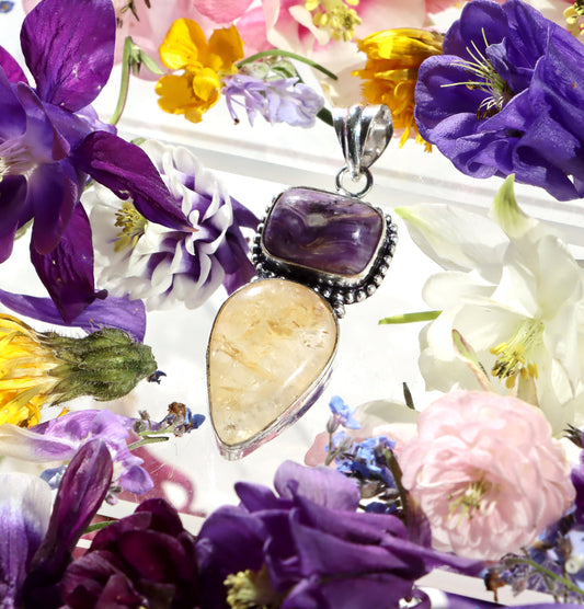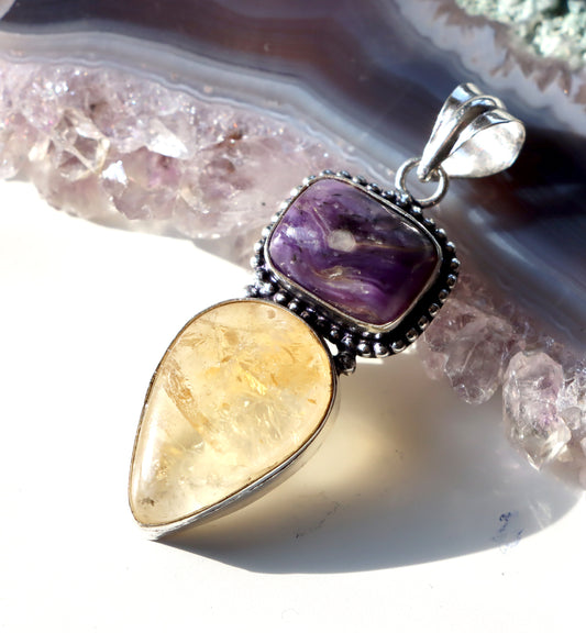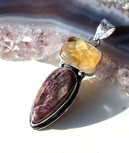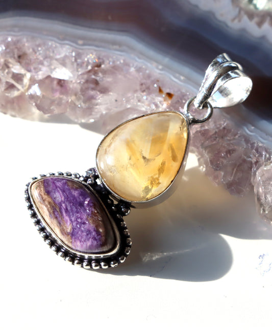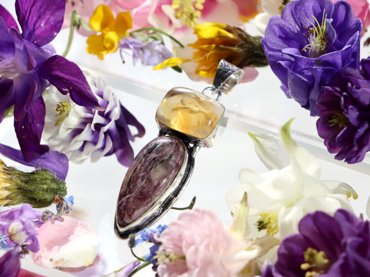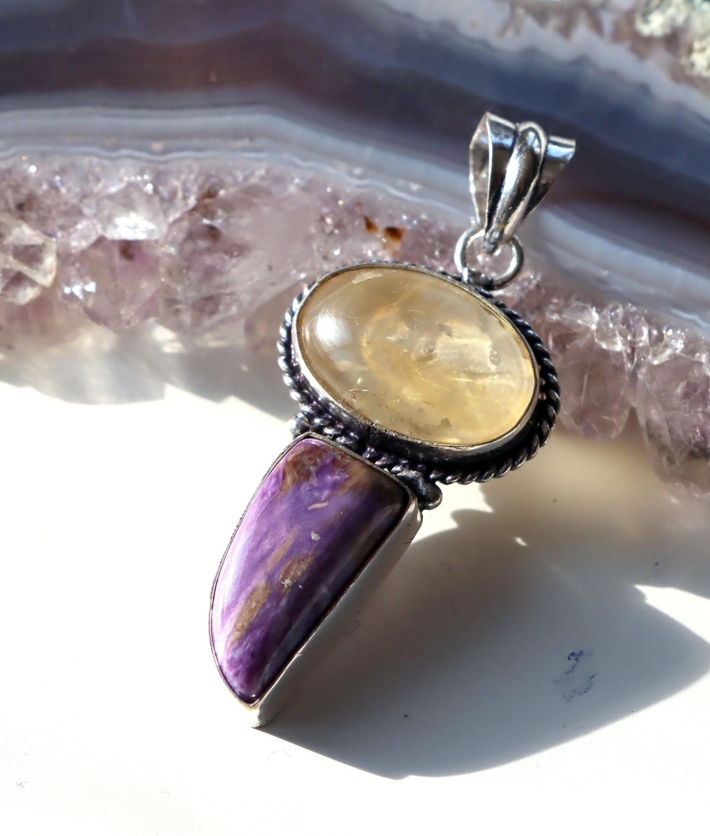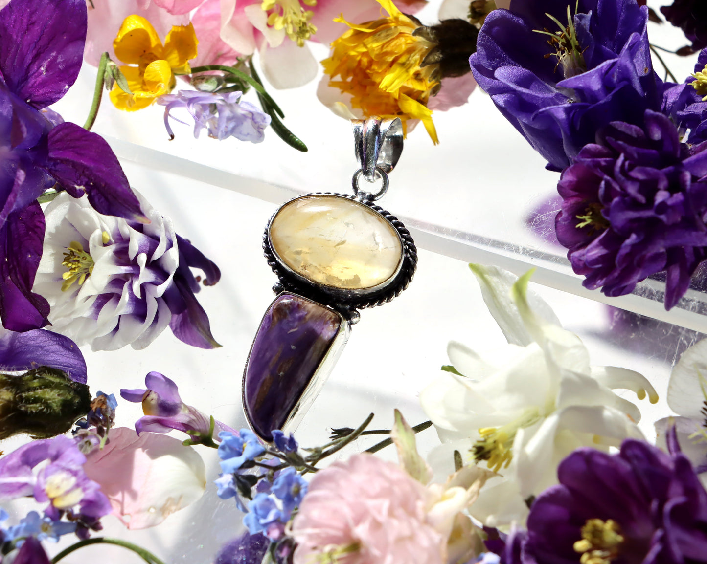 Kombinace citrínu a charoitu vytváří amulet, který spojuje energii pozitivního myšlení a duchovní transformace. Citrín je známý pro svou schopnost přinášet radost, úspěch a pozitivní energii. Podporuje kreativitu, sebedůvěru a pomáhá při manifestaci cílů. Je také ceněn pro své vlastnosti, které zvyšují motivaci a pomáhají přitahovat příležitosti. Charoit, na druhé straně, je silně spojen s duchovním růstem, překonáváním strachů a přijetím změn. Pomáhá při hlubokém duchovním prozkoumávání a uzdravování.