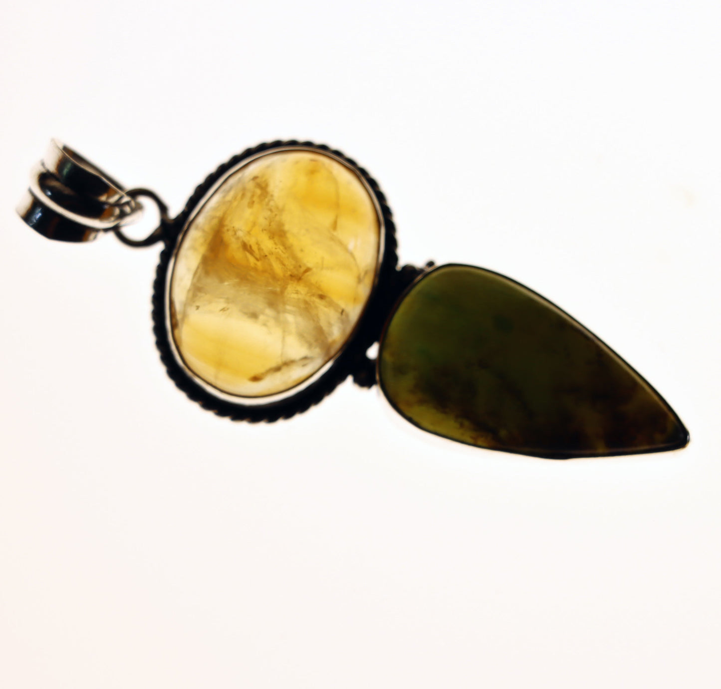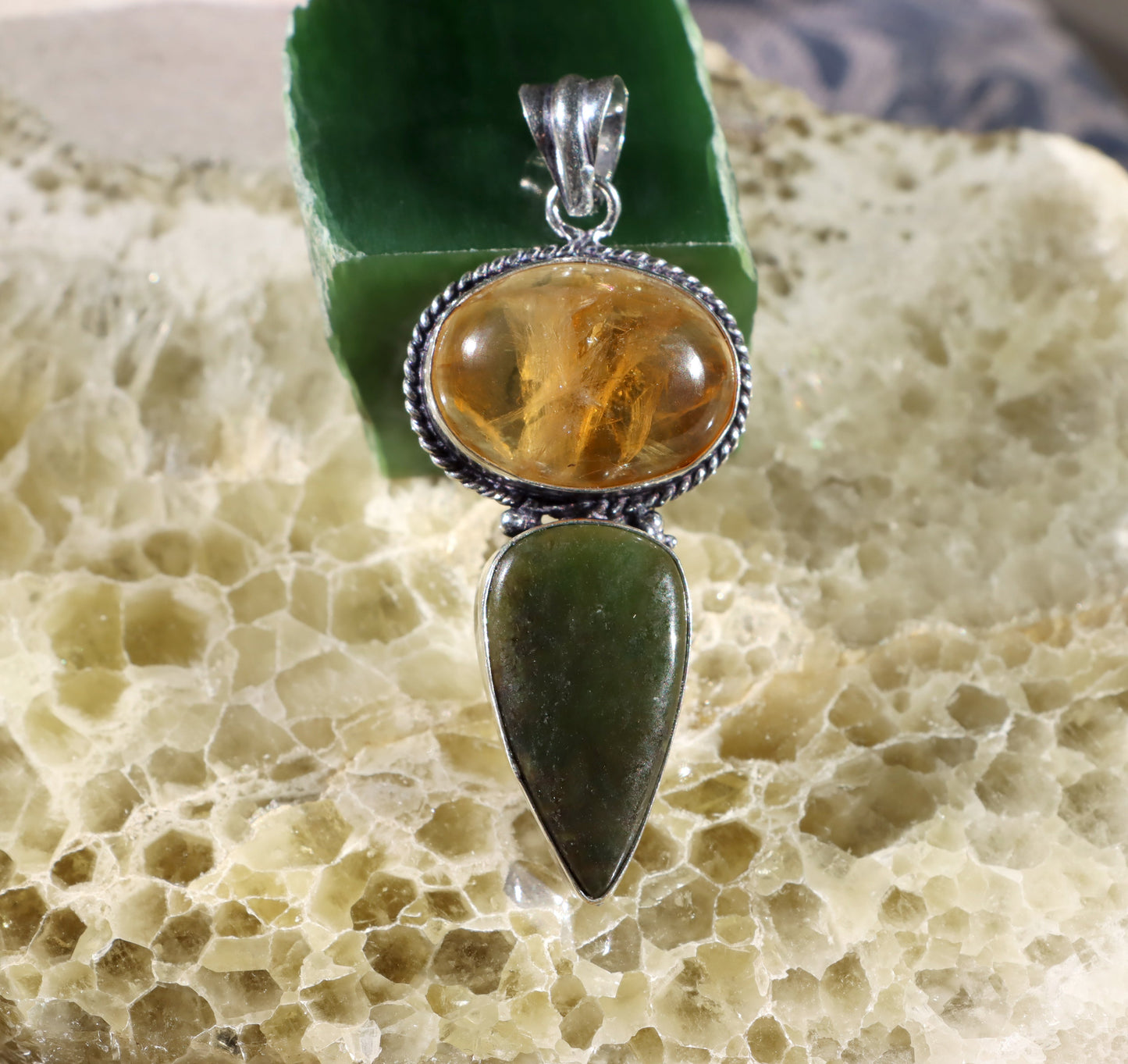 Amulet prosperity a ochrany: Přívěsek Citrín & Nefrit. Tento přívěsek spojuje energii citrínu s ochranou nefritu, čímž vytváří mocný talisman pro úspěch, hojnost a harmonii. Citrín, se svou jasnou zlatavou září, přitahuje prosperitu, pozitivní energii a podporuje sebevědomí. Nefrit, známý jako kámen klidu a ochrany, přináší stabilitu, posiluje odvahu a pomáhá udržovat vnitřní rovnováhu. Společně tyto kameny tvoří amulet, který přitahuje štěstí, podporuje finanční úspěch a zároveň chrání nositele před negativními vlivy. Ideální pro ty, kdo hledají harmonii mezi materiálním a duchovním světem.