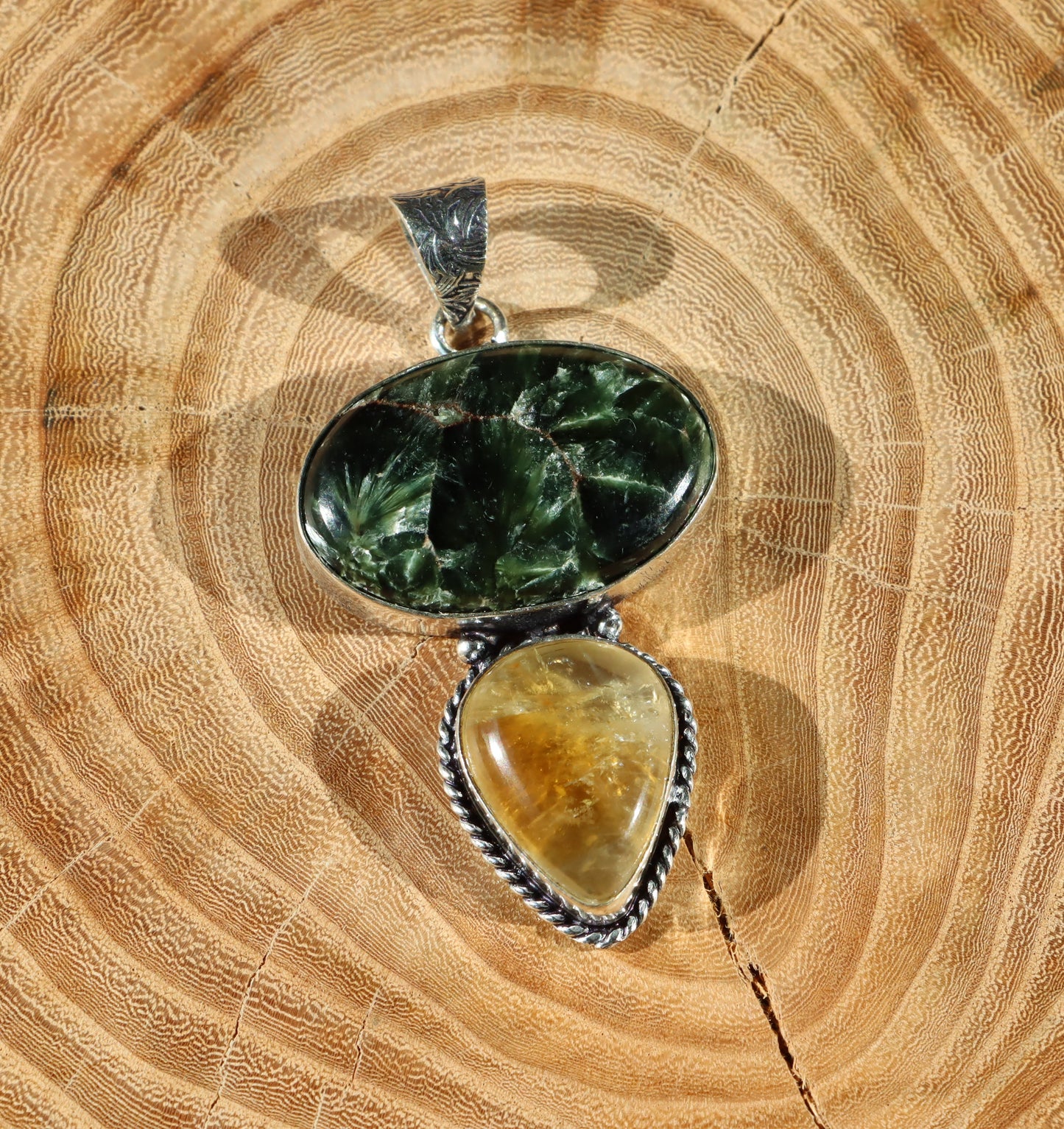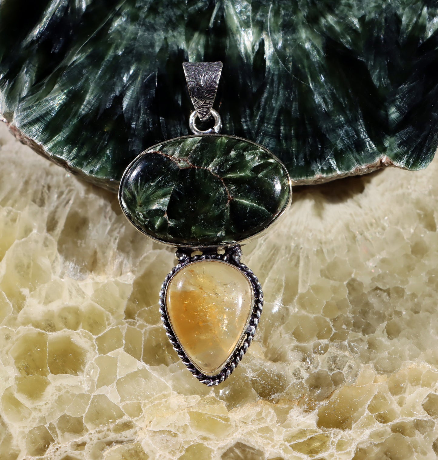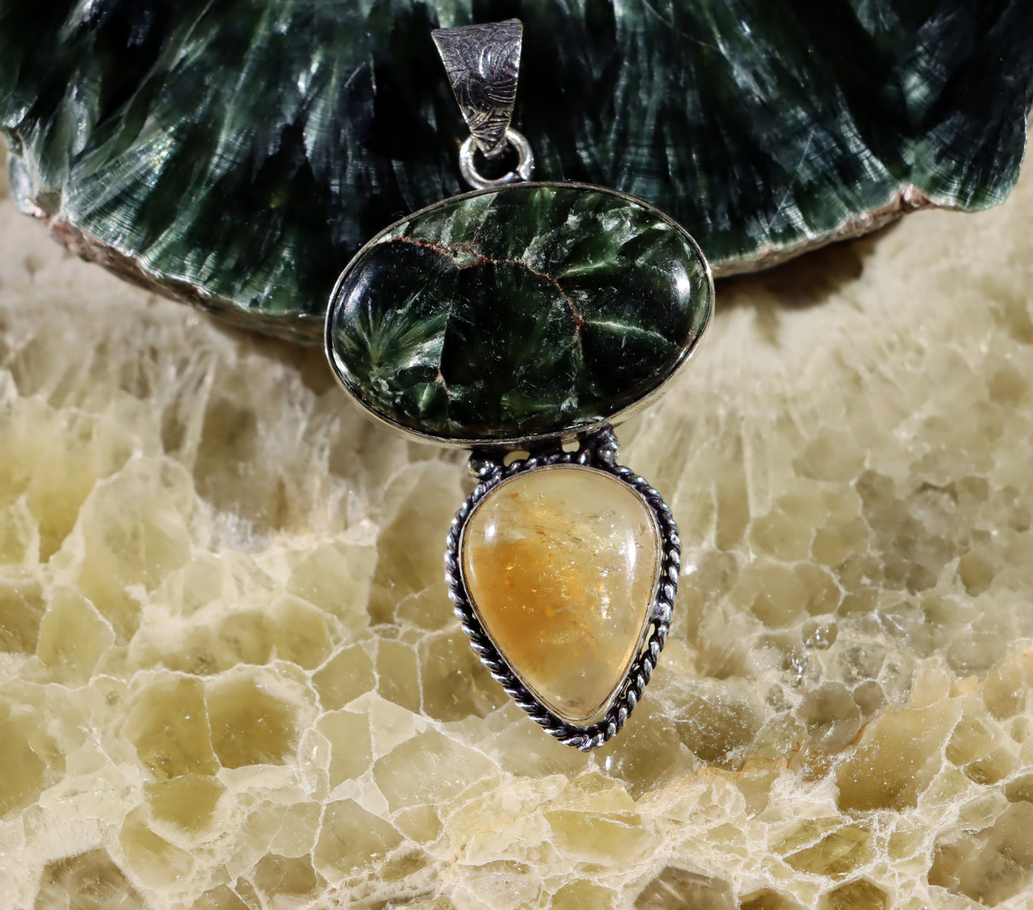 Kombinace citrínu a serafinitu vytváří amulet, který spojuje pozitivní energii s duchovním vhledem. Citrín je známý pro svou schopnost přinášet radost, úspěch a pozitivní myšlení. Podporuje kreativitu, sebevědomí a pomáhá při manifestaci cílů. Je ceněn pro svou schopnost zvyšovat motivaci a přitahovat příležitosti. Serafinit, na druhé straně, je kámen duchovního růstu, intuice a harmonie. Pomáhá při duchovní očistě, hlubokém propojení a léčení těla i duše.