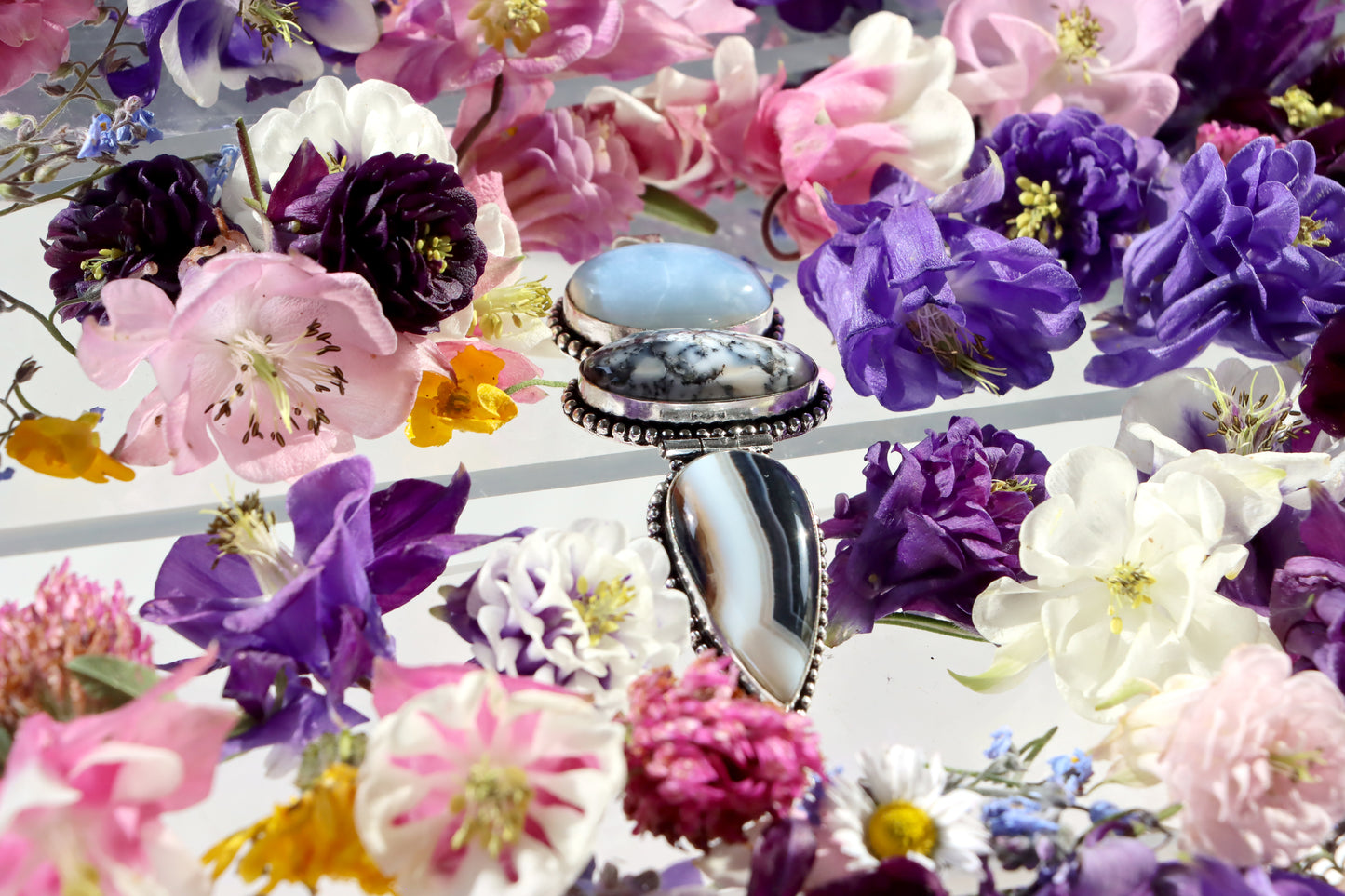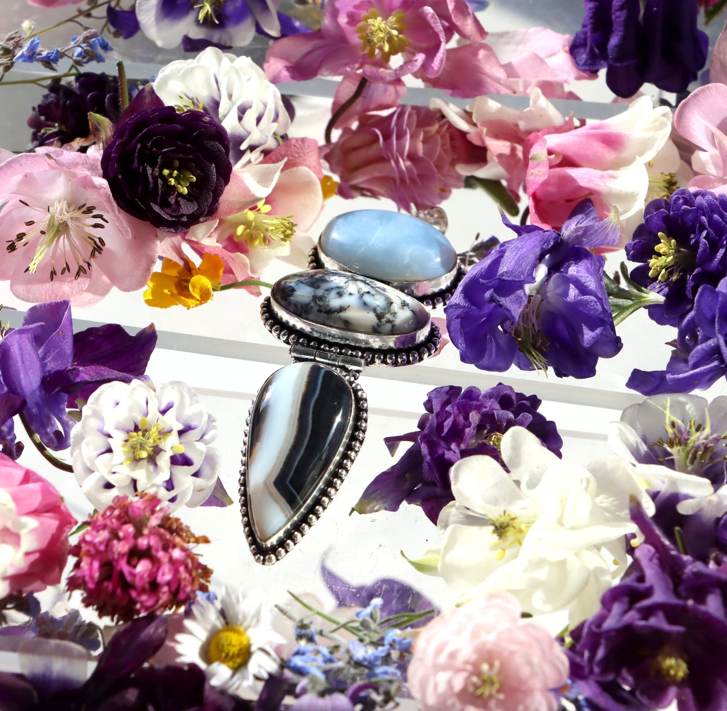 Opál Owyhee, známý svými krásnými modro-šedými až modro-zelenými odstíny, zvyšuje kreativitu, intuici a duchovní uvědomění. Pomáhá při rozvoji osobních talentů a poskytuje inspiraci. Páskovaný onyx, se svými charakteristickými pruhy, poskytuje silné uzemnění, ochranu a stabilitu. Pomáhá při ochraně před negativními vlivy a podporuje emocionální vyrovnanost. Tato kombinace přináší harmonii mezi emocionálním léčením, kreativním projevením a praktickým uzemněním. Dendritický opál poskytuje klid a introspekci, opál Owyhee přináší kreativitu a intuici, zatímco páskovaný onyx podporuje stabilitu a ochranu. Společně tyto kameny podporují celkovou rovnováhu, osobní růst a harmonii v životě.