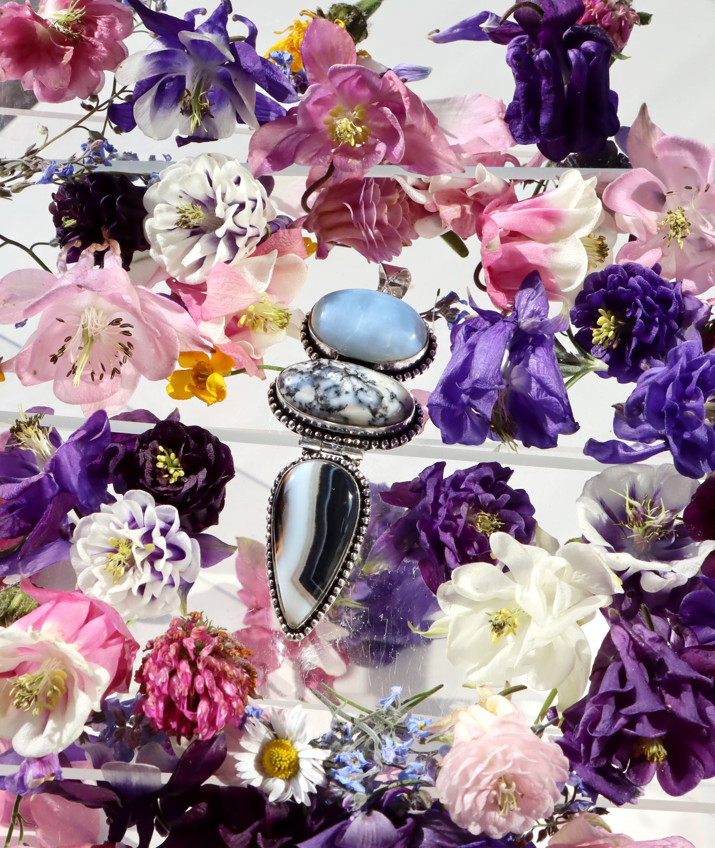 Kombinace dendritického opálu, opálu Owyhee a páskovaného onyxu vytváří amulet, který spojuje emocionální léčení, kreativitu a uzemnění. Dendritický opál, s jeho jemnými dendritickými vzory, podporuje hluboké emocionální léčení, introspekci a pocit klidu. Pomáhá při osobním růstu a rozvoji intuice.