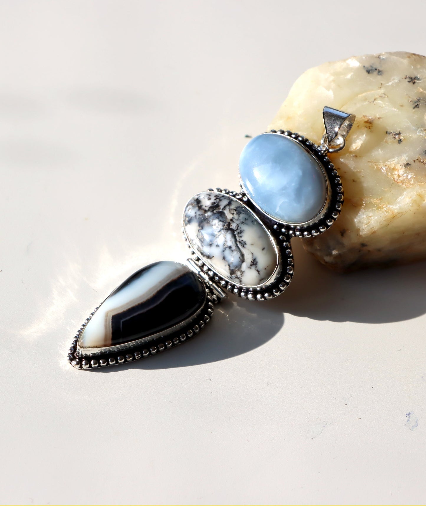 Amulet rovnováhy a duchovního propojení: Přívěsek Dendritický opál, Owyhee opál & Páskovaný onyx. Tento přívěsek spojuje energii tří unikátních kamenů, které přinášejí duchovní hloubku, emocionální harmonii a ochranu. Dendritický opál, s jeho přírodními kresbami připomínajícími větvičky, podporuje vnitřní růst, stabilitu a propojení s přírodou. Owyhee opál, známý svou jemně modrou barvou, přináší klid, čistotu mysli a usnadňuje duchovní komunikaci. Páskovaný onyx dodává sílu, ochranu a pomáhá udržet stabilitu i v náročných situacích. Tato kombinace kamenů vytváří amulet, který vyrovnává energie, podporuje duchovní rozvoj a zároveň poskytuje ochranu a vnitřní klid v každodenním životě.