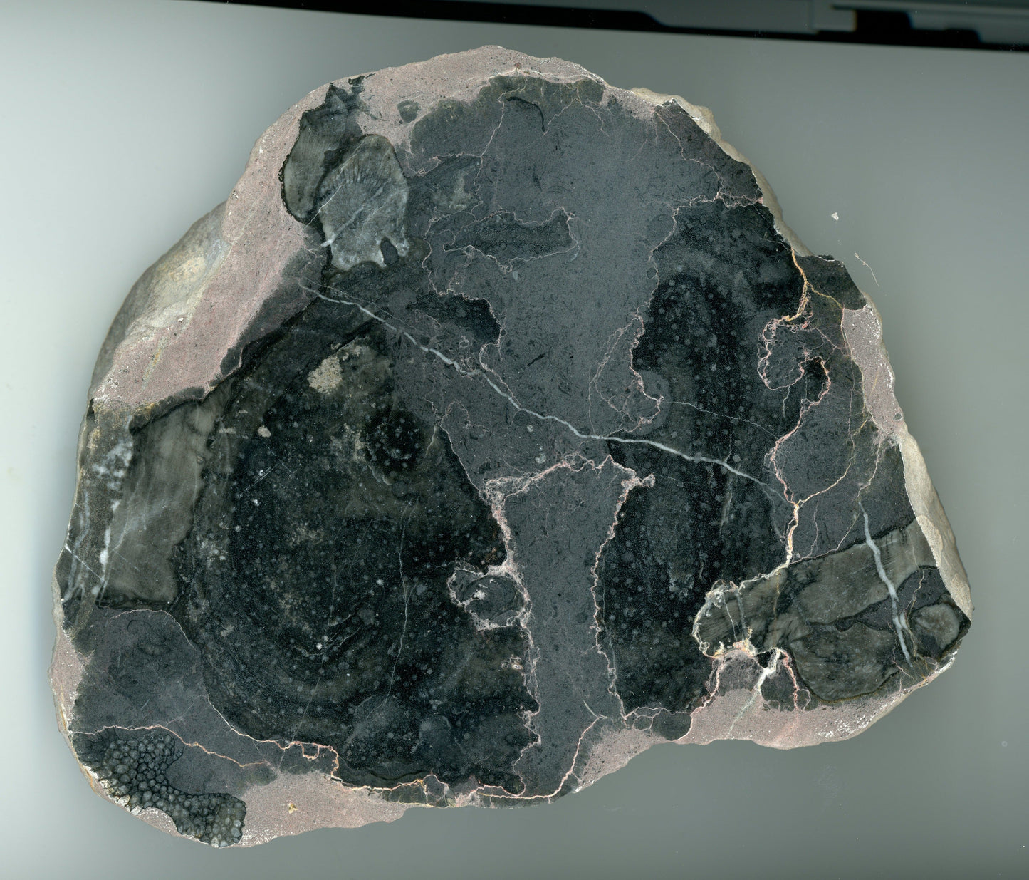Leštěný řez vápencem s různými druhy zkamenělých korálů.