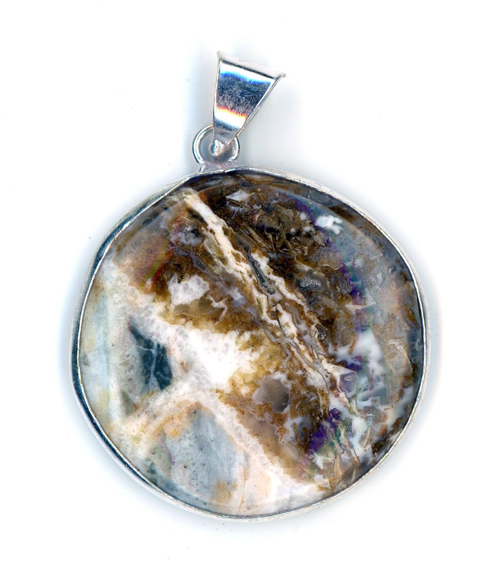 Broušený kabošon zasazený do postříbřeného kovu (měď nebo bronz). Ryzost stříbra je 925/1000.