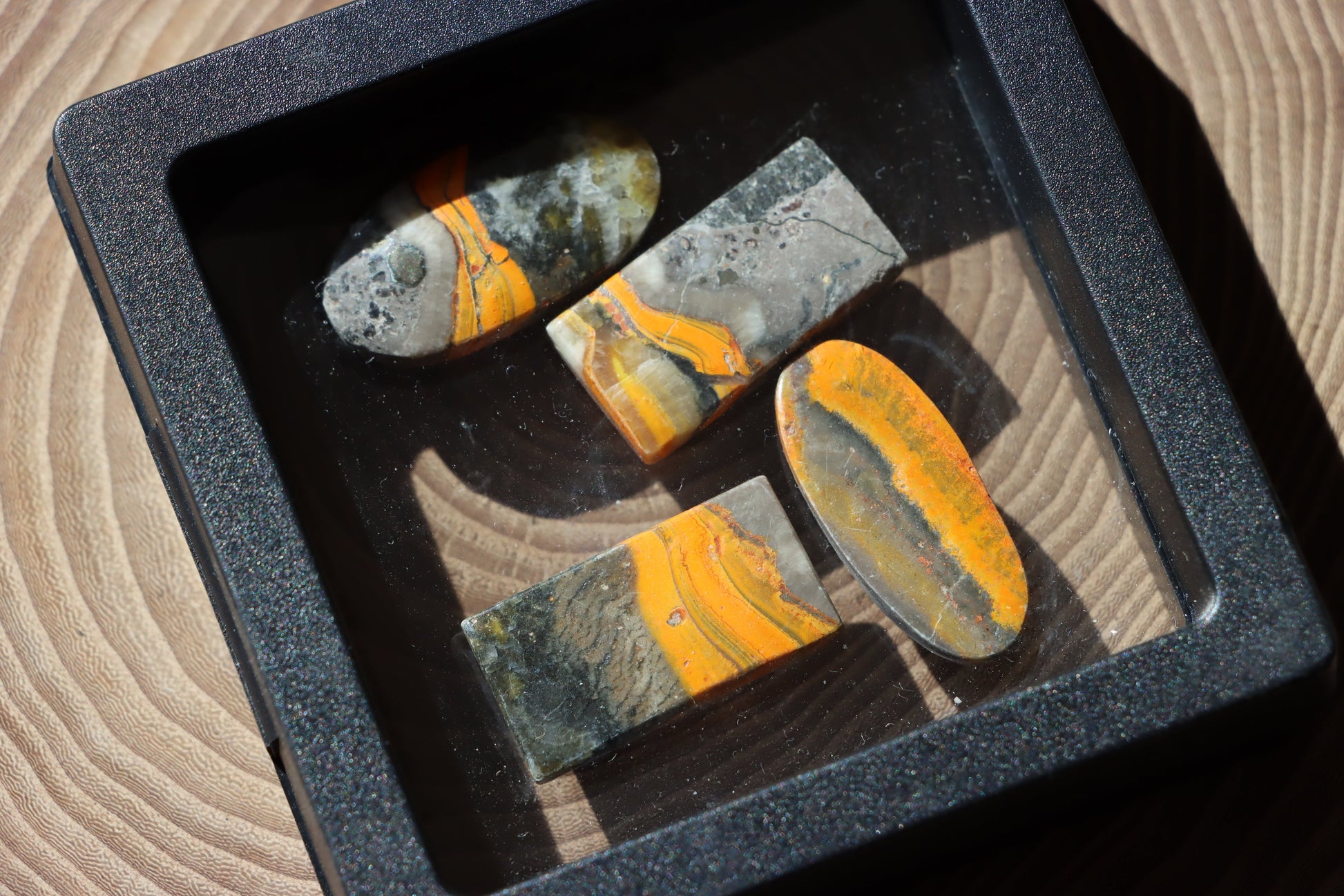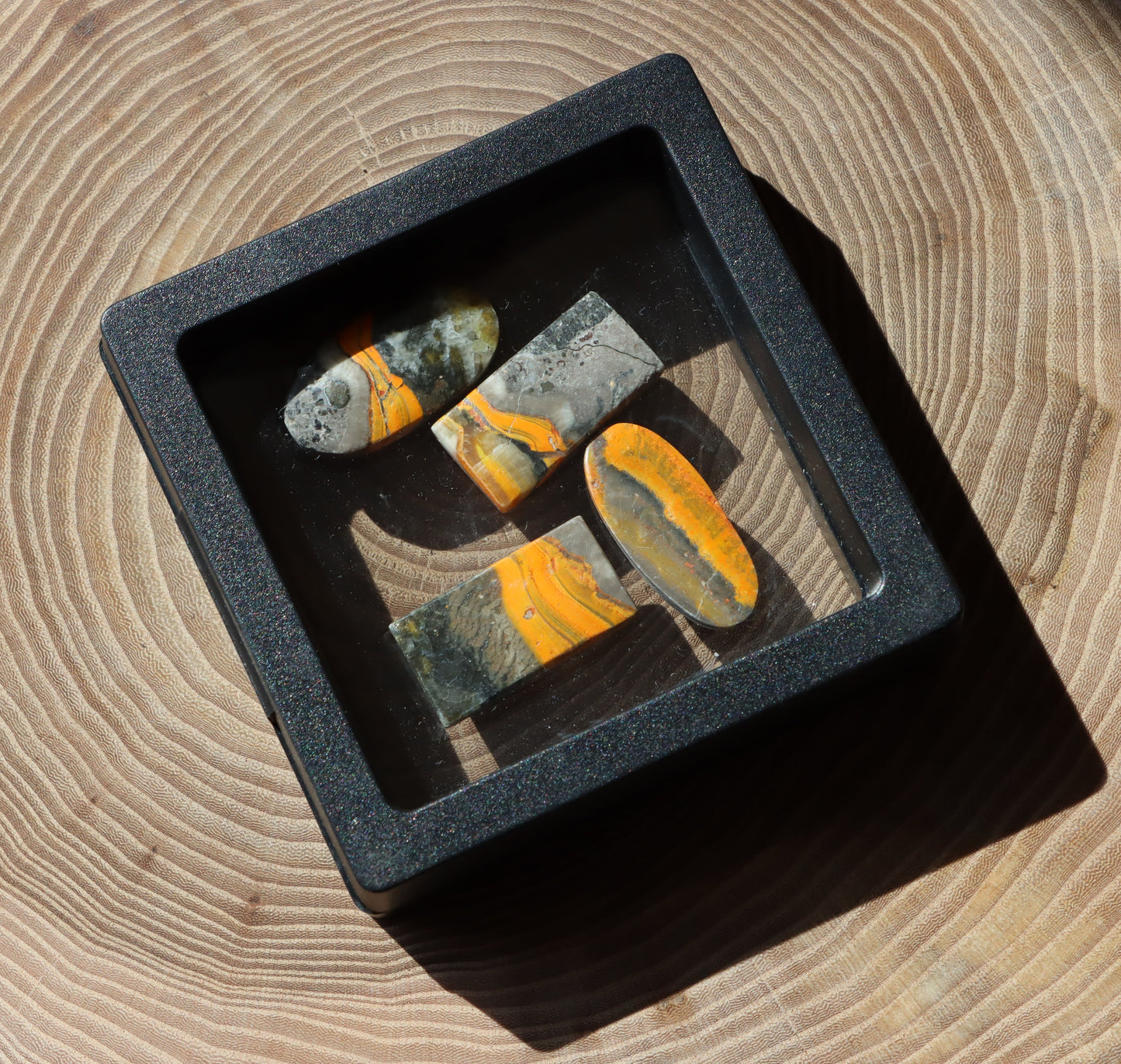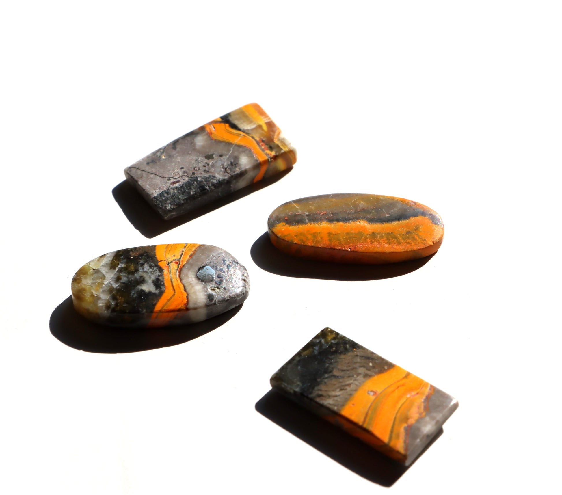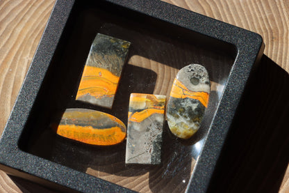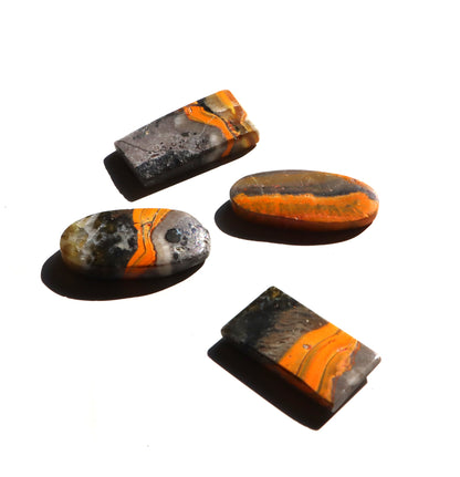 Sada čtyř kabošonů z barevně výrazného čmeláčího jaspisu, známého pro své vrstvy ve žluté, oranžové, šedé a černé. Každý kus má jedinečnou kresbu připomínající zbarvení čmeláka. Vhodné pro šperky nebo sbírku.