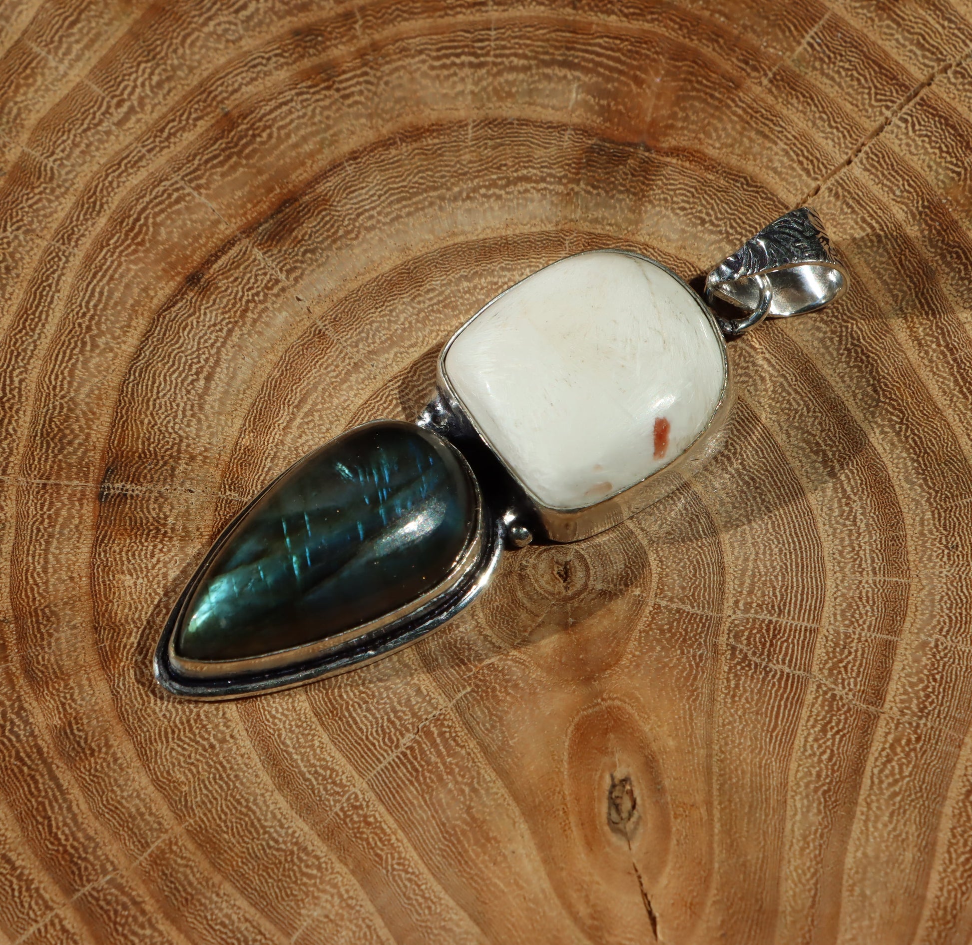 Amulet mystické transformace: Přívěsek Labradorit & Skolecit. Spojení labradoritu a skolecitu v tomto přívěsku vytváří mocný amulet, který přináší harmonii mezi transformací a duchovním růstem. Labradorit, se svými okouzlujícími duhovými odlesky, je kámen mystiky a ochrany, který podporuje intuici a pomáhá při transformaci a změnách. Skolecit, s jemnými bílými a krémovými tóny, přináší hluboký klid, duchovní propojení a meditativní stav. Tato kombinace je ideální pro ty, kteří chtějí rozvíjet svou intuici, podpořit vnitřní růst a nalézt klid v náročných situacích. Amulet je zároveň nádherným šperkem, který vás provází na cestě k osobnímu rozvoji a duchovní harmonii.