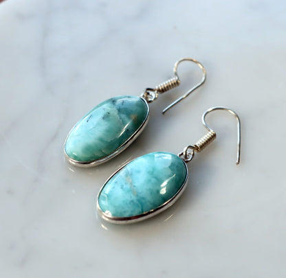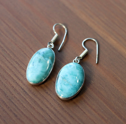 Dva oválné kabošony larimaru v odstínech karibské modři přinášejí jemnost a ženskou sílu. Larimar je kámen klidu, komunikace a harmonie – připomíná vlnu, která hladí a tiší. Stříbrné uchycení nechává vyniknout přirozenou kresbu kamene. Náušnice, které jako šepot moře vnášejí mír do každého dne.