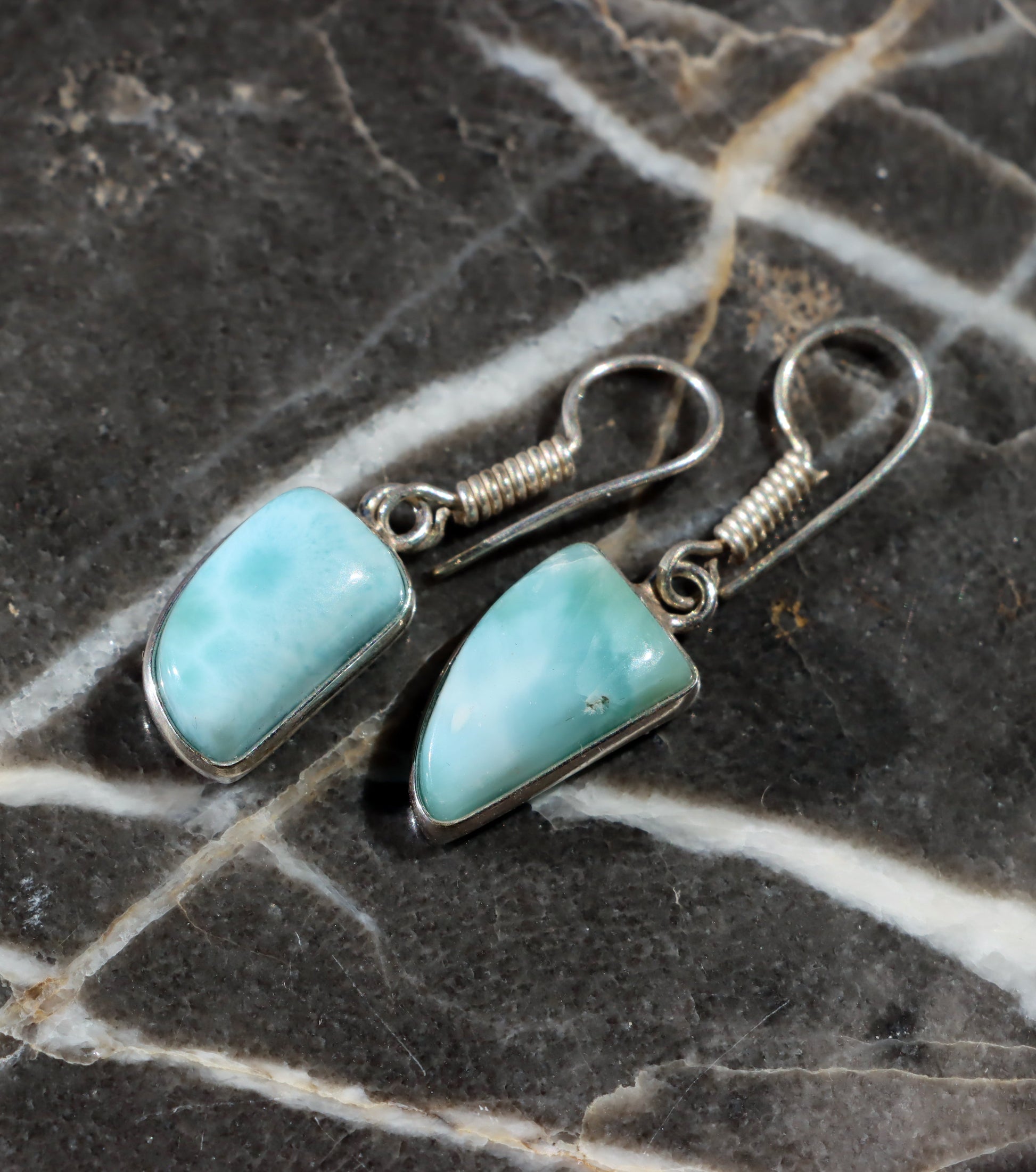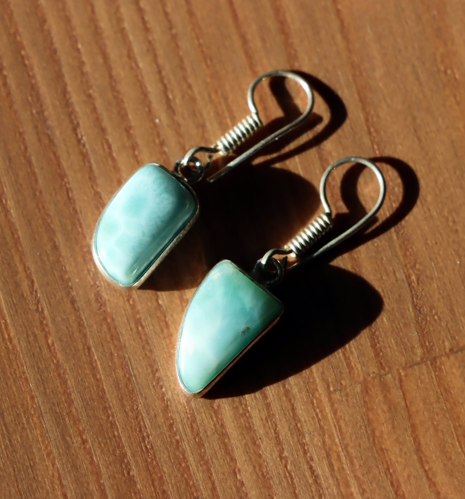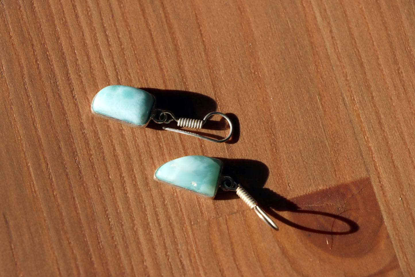 Dva oválné kabošony larimaru v odstínech karibské modři přinášejí jemnost a ženskou sílu. Larimar je kámen klidu, komunikace a harmonie – připomíná vlnu, která hladí a tiší. Stříbrné uchycení nechává vyniknout přirozenou kresbu kamene. Náušnice, které jako šepot moře vnášejí mír do každého dne.