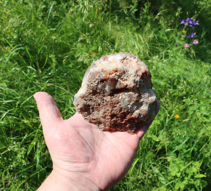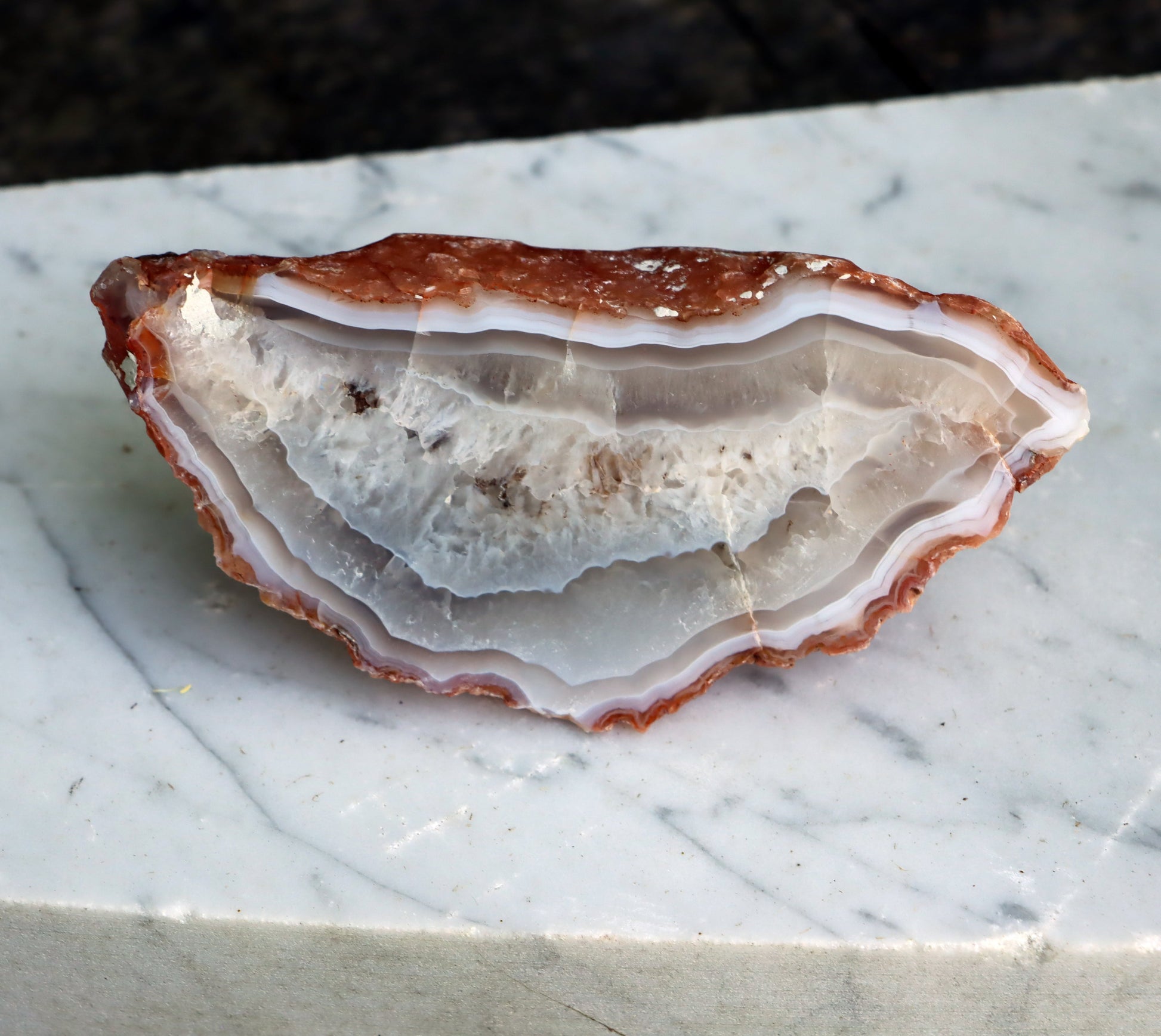 Na fotografii je leštěný plátek bělavého achátu s centrální výplní tvořenou křemenem. Kámen má typickou koncentrickou strukturu – po obvodu se střídají světle šedé a bílé pásy chalcedonu, které rámují průsvitný až mléčně bílý střed.