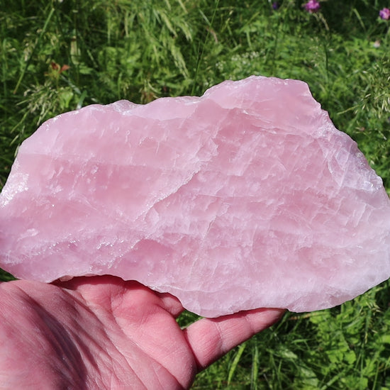 Na fotografii je leštěný plátek růženínu s typickou sytě růžovou barvou. Povrch kamene je hladce vyleštěný, což zvýrazňuje jeho jemně vláknitou až zakalenou strukturu, danou příměsí mikroskopických inkluzí.