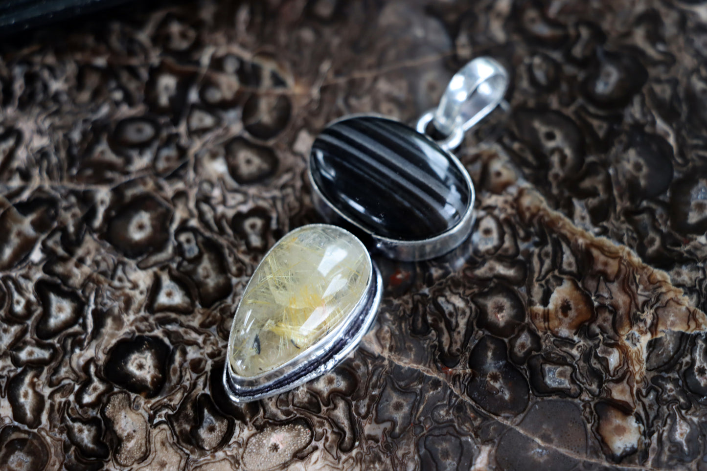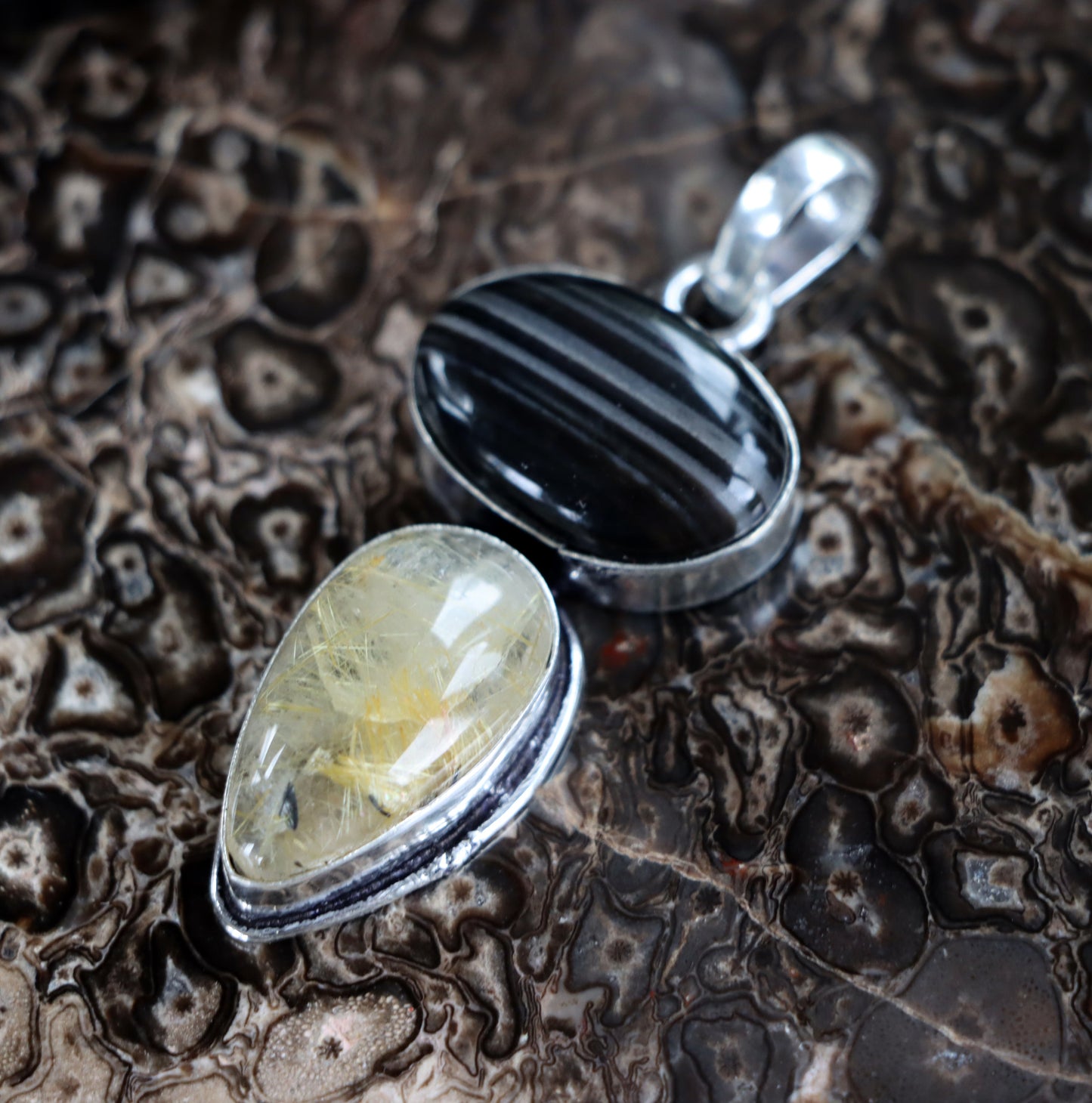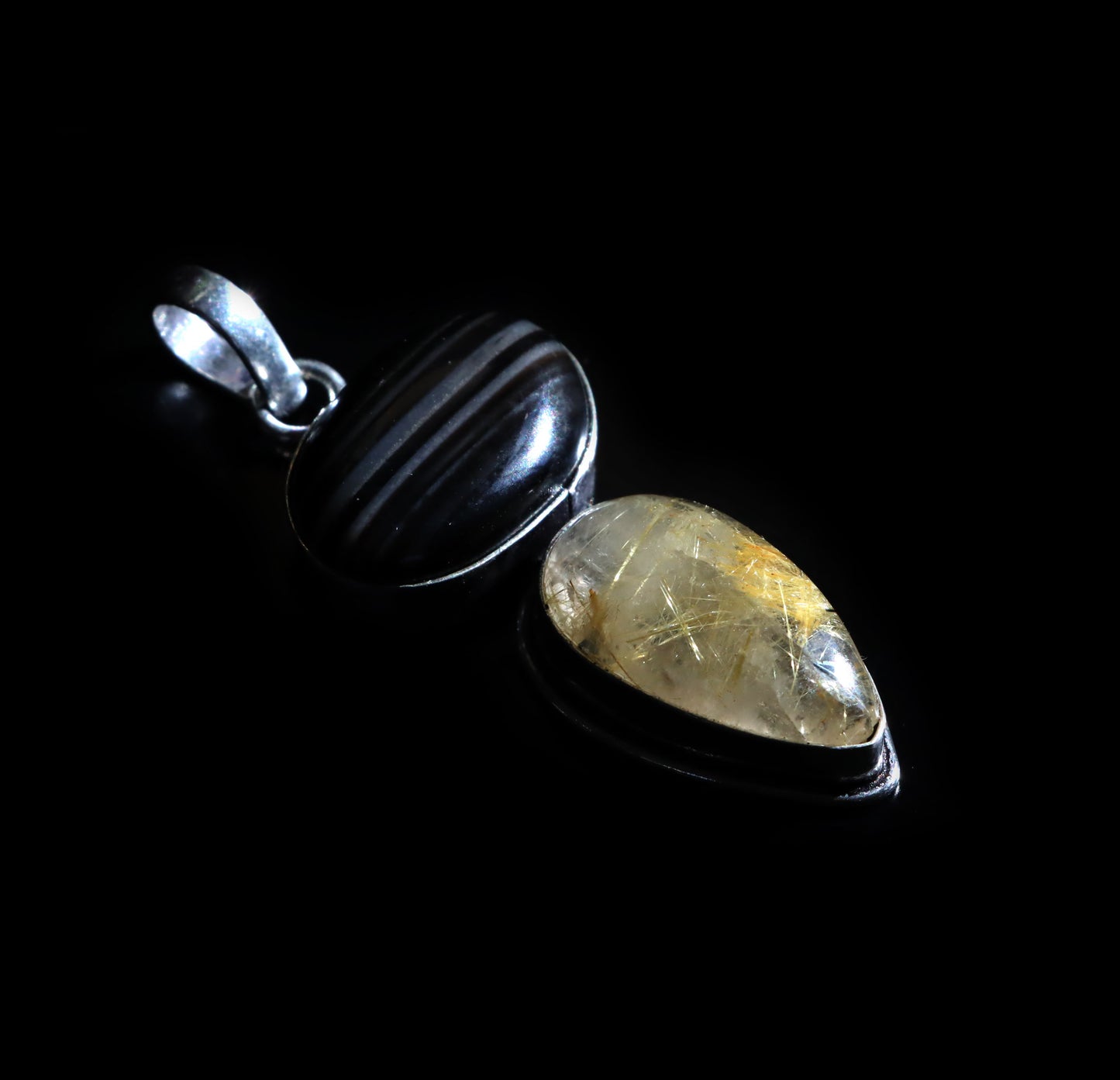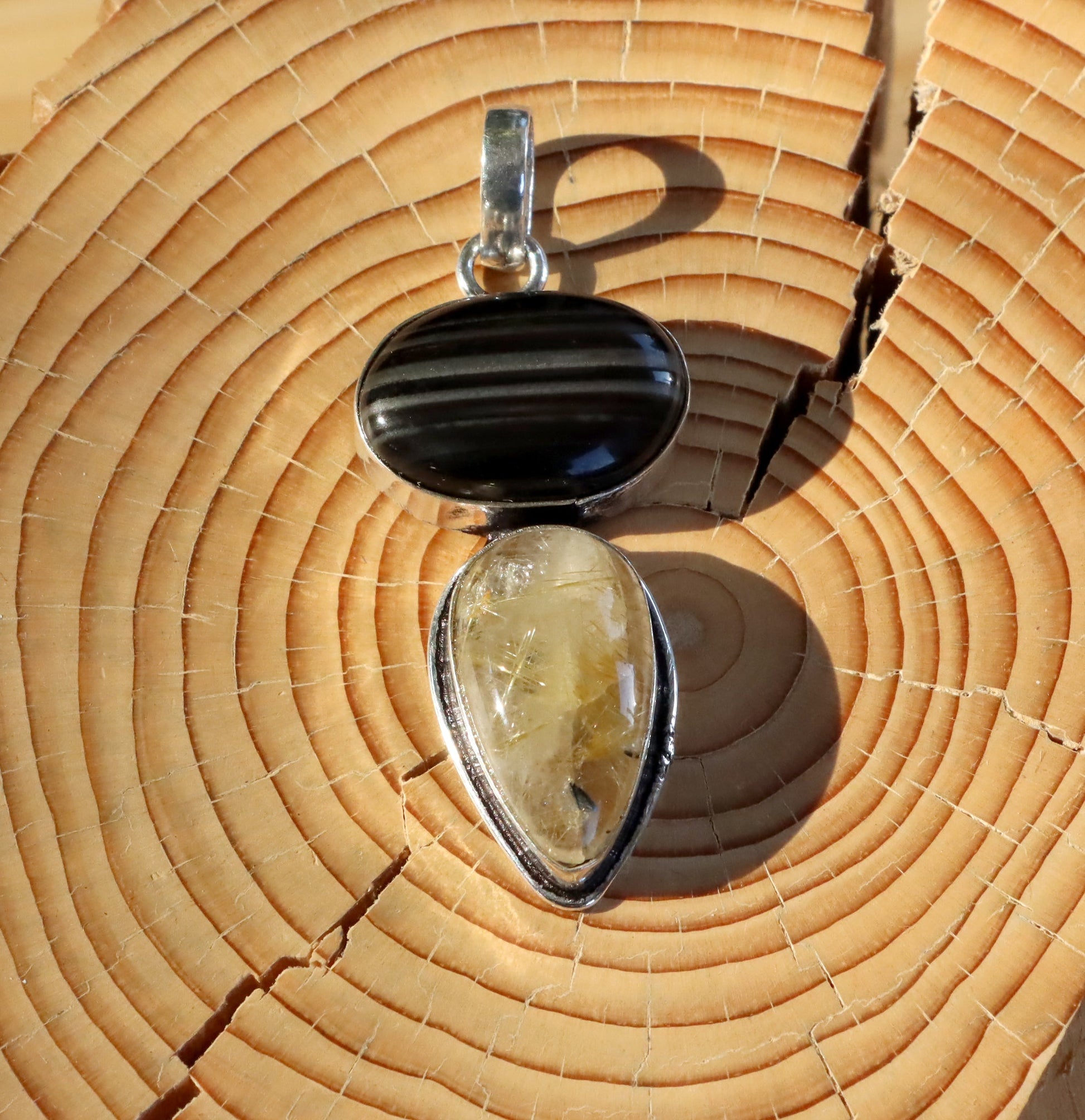 Amulet jasnosti a síly: Přívěsek Rutil v křišťálu & Onyx. Tento přívěsek kombinuje dva silné minerály, které poskytují ochranu, jasnost a vnitřní sílu. Rutil v křišťálu, s jemnými zlatými nitkami uvnitř čirého křišťálu, podporuje duchovní růst, dodává energii a pomáhá s jasností myšlenek. Onyx, s jeho hlubokou černou barvou, přináší ochranu, stabilitu a odvahu, zároveň posiluje sebedůvěru. Společně tyto kameny vytvářejí amulet, který posiluje mysl, chrání před negativními energiemi a dodává sílu k překonávání překážek.