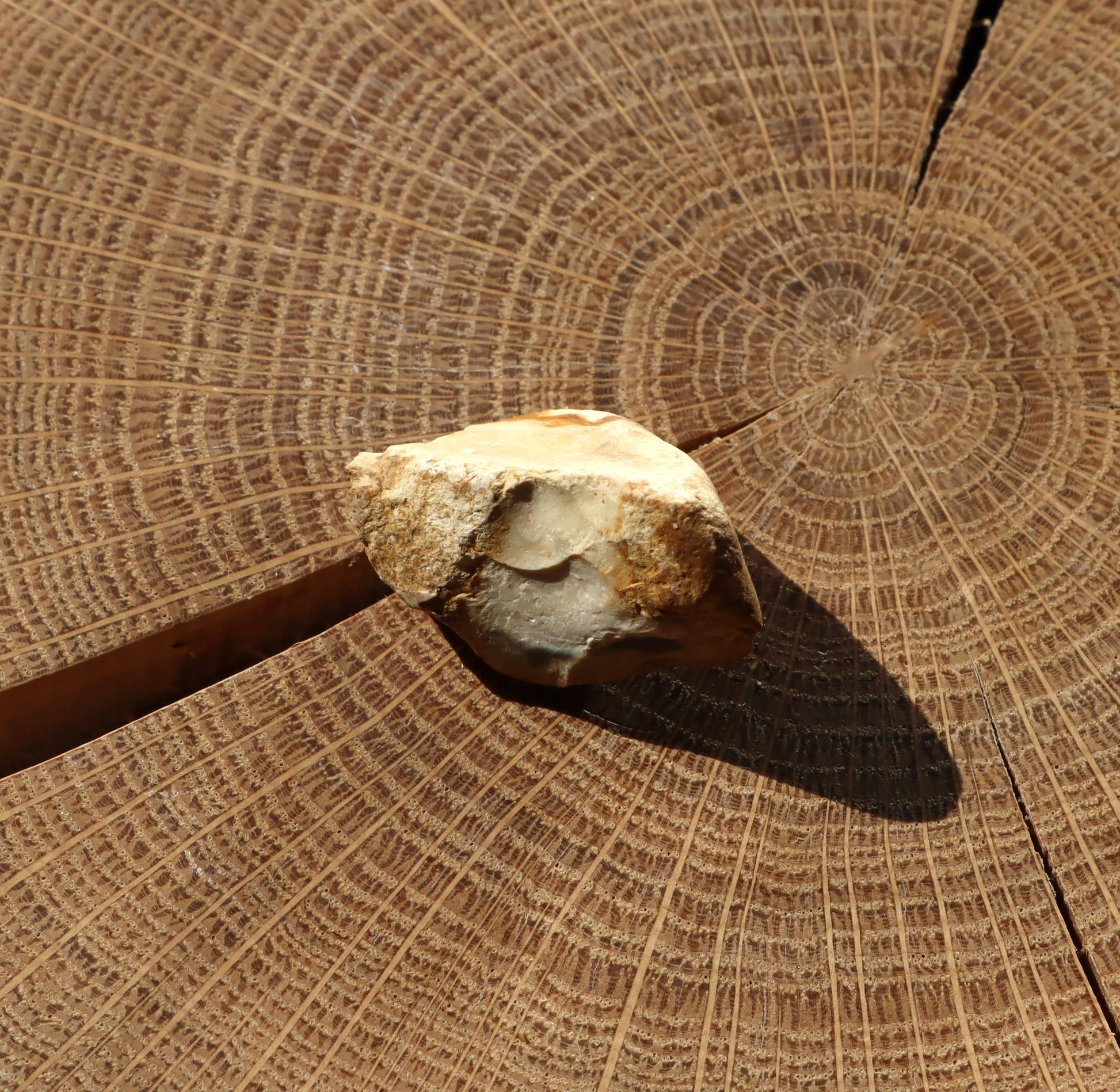 Jurský winchesterský rohovec s typickou bílou kůrou a tmavým, někdy karamelovým, výjimečně jinak barevným rohovcovým jádrem.