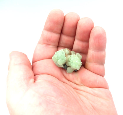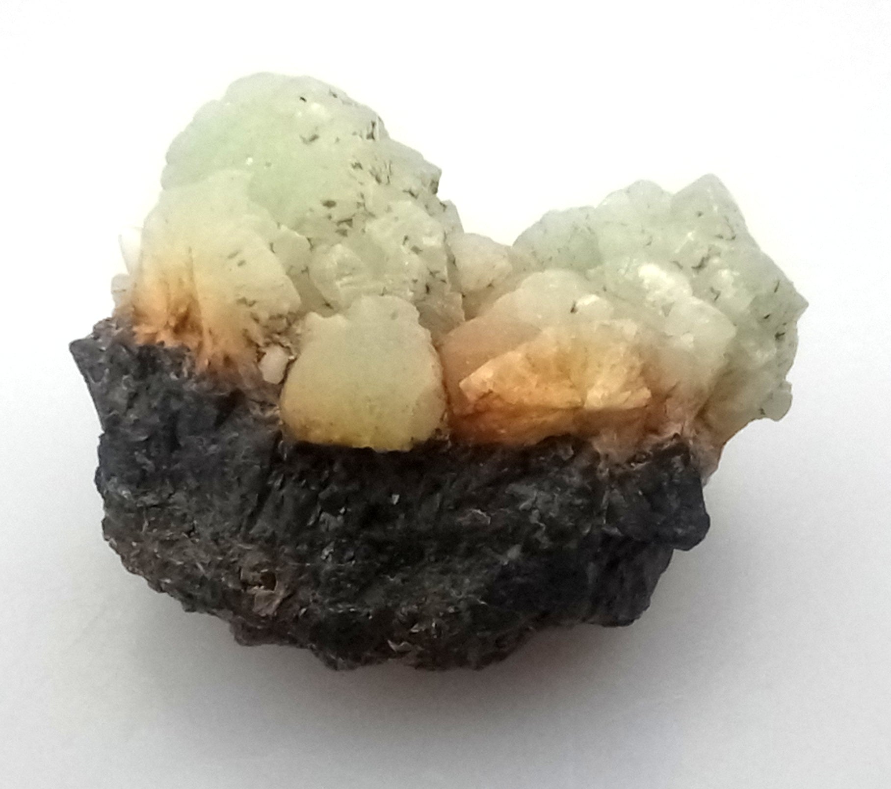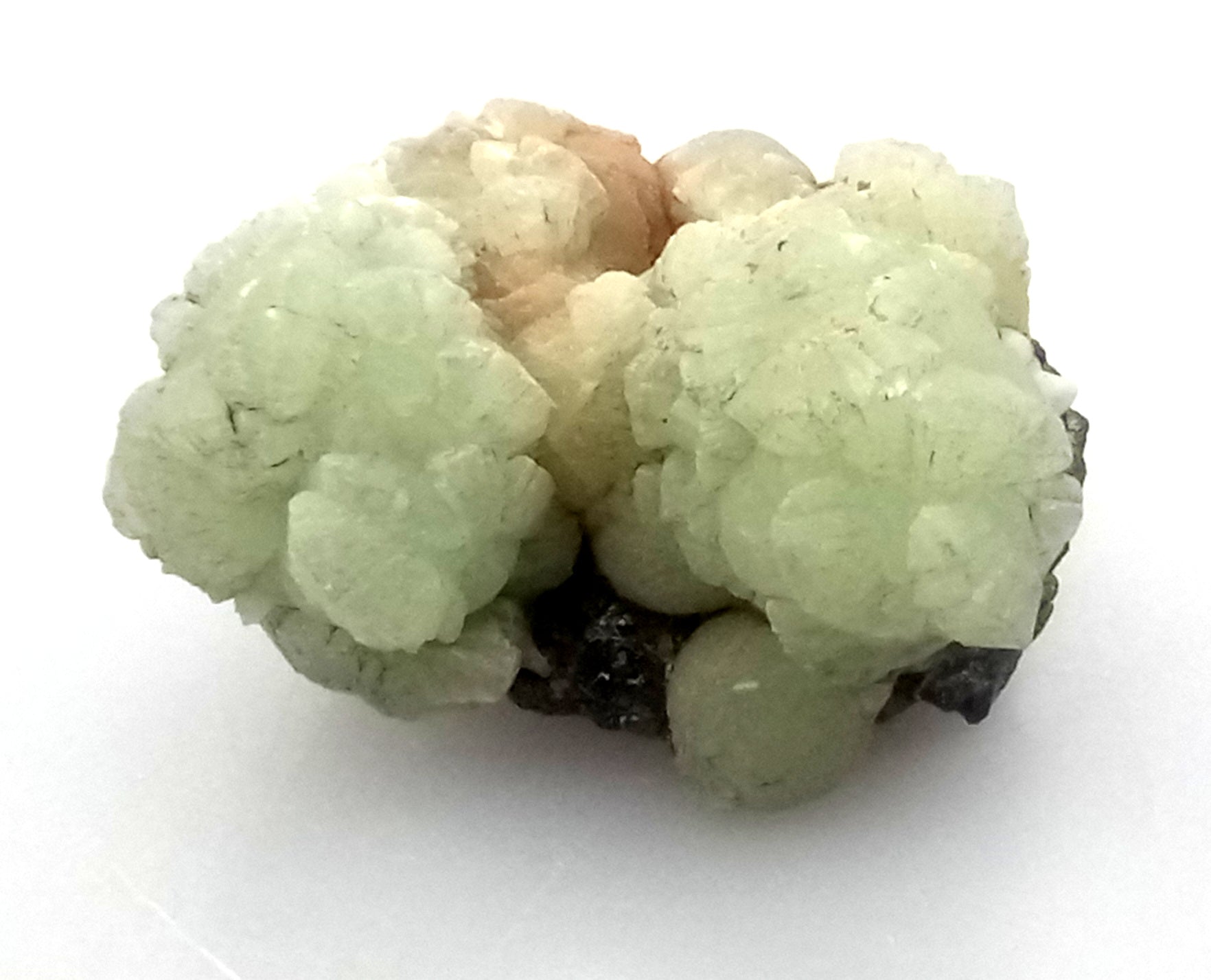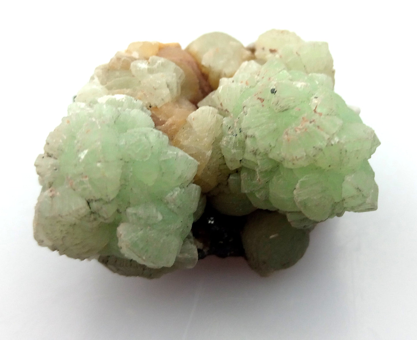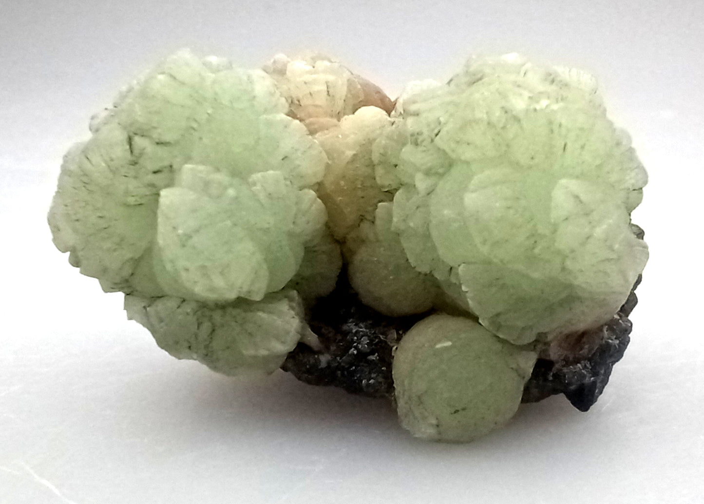 Kupkovité krystaly prehnitu na podložce.