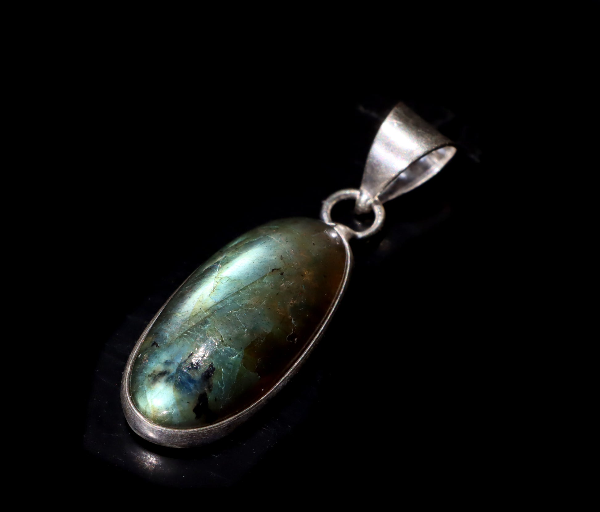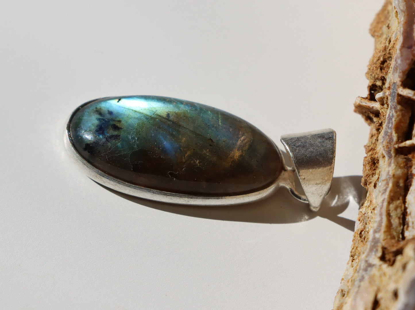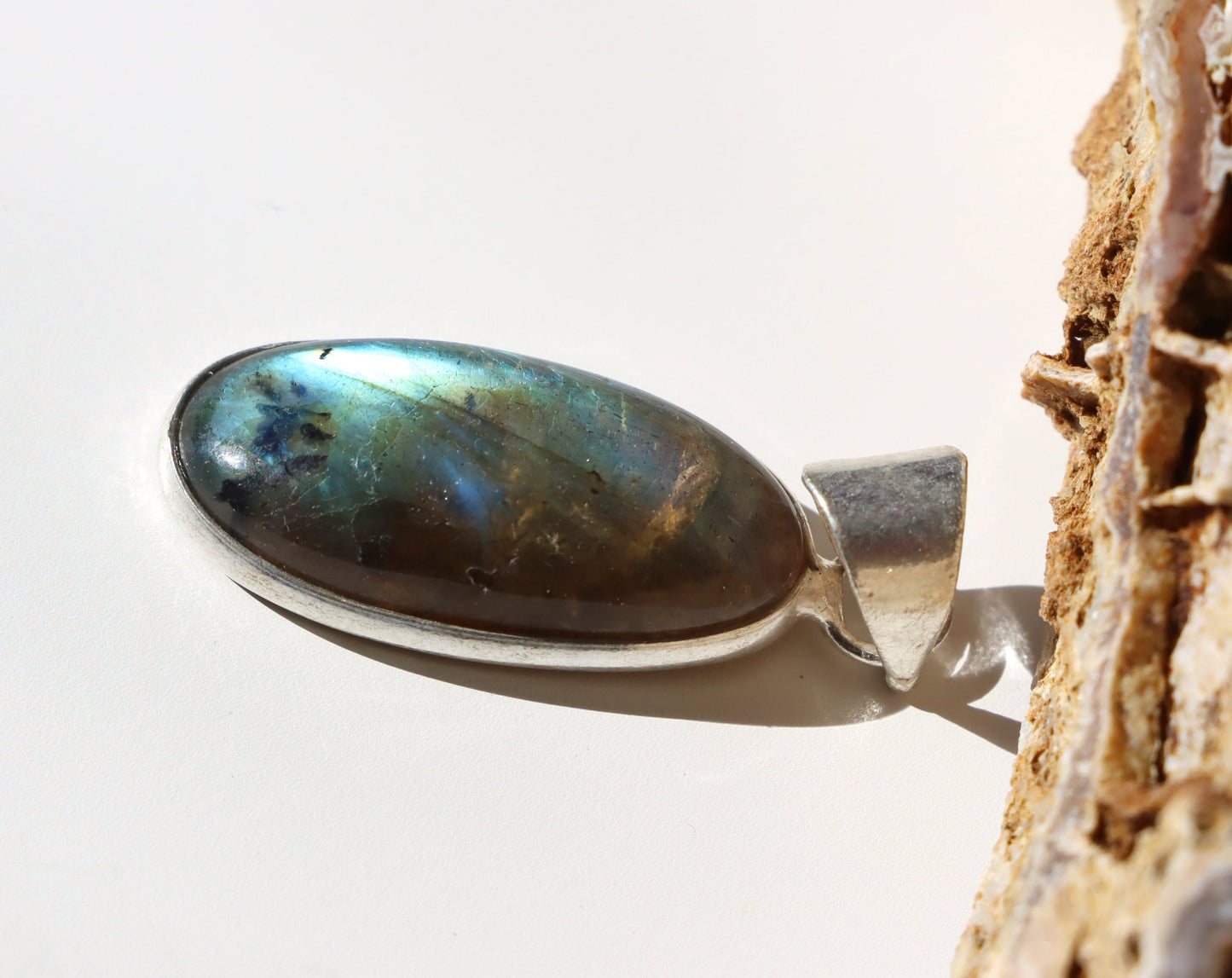 Decentní přívěsek z labradoritu s typickým duhovým leskem v odstínech modré a zelené. Kámen je spojován s ochranou, intuicí a posílením vnitřní síly. Skvělý jako nenápadný doplněk i osobní talisman.