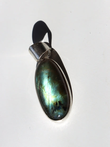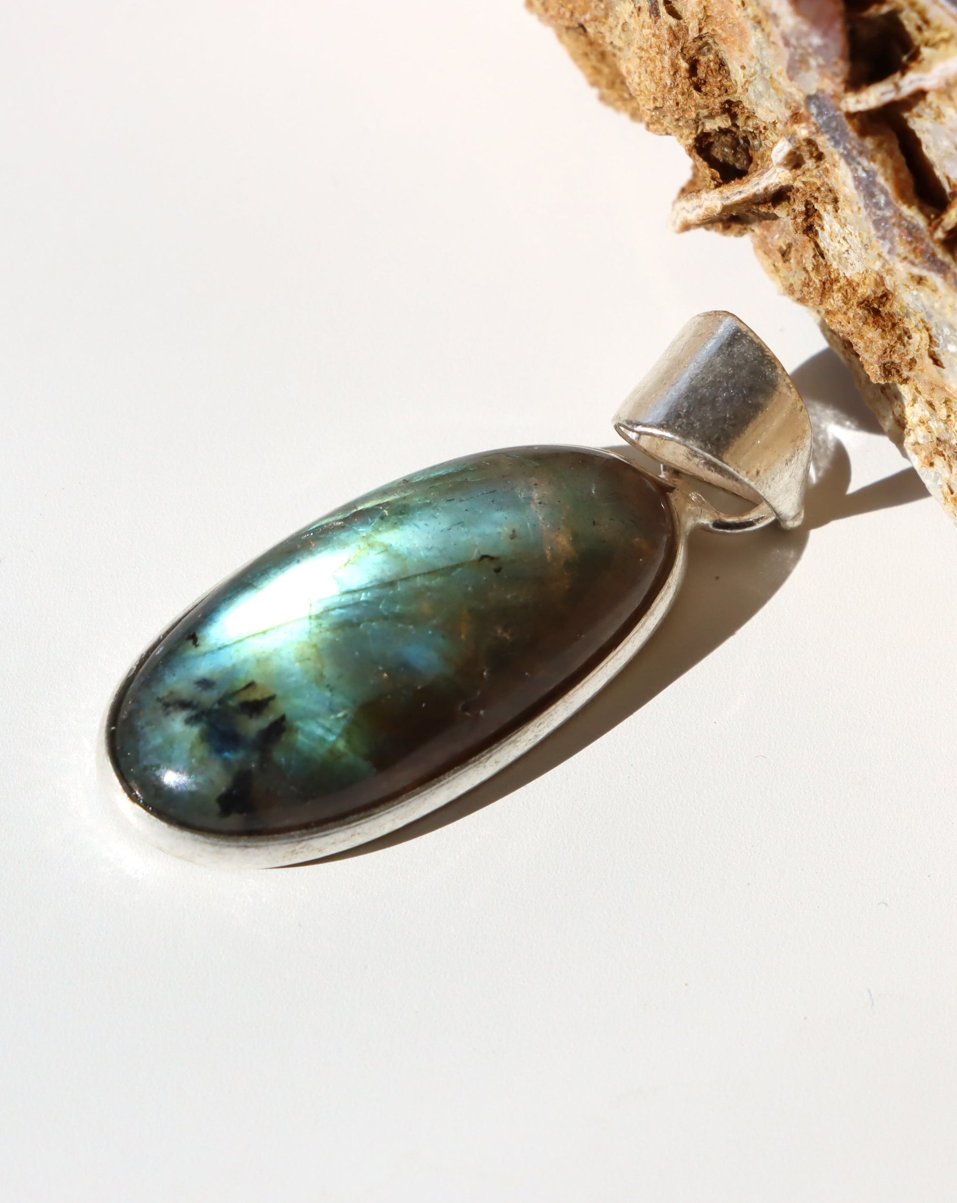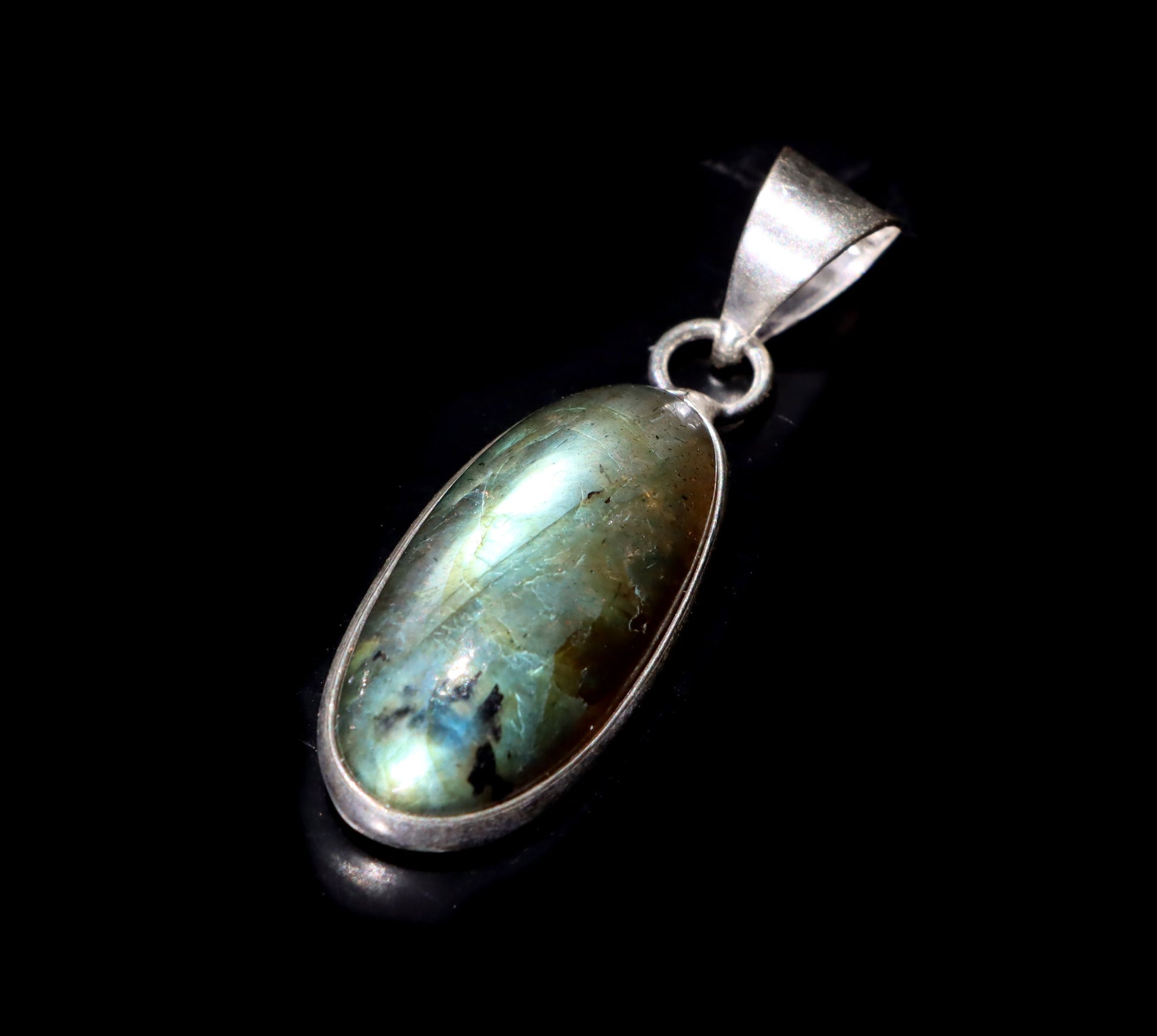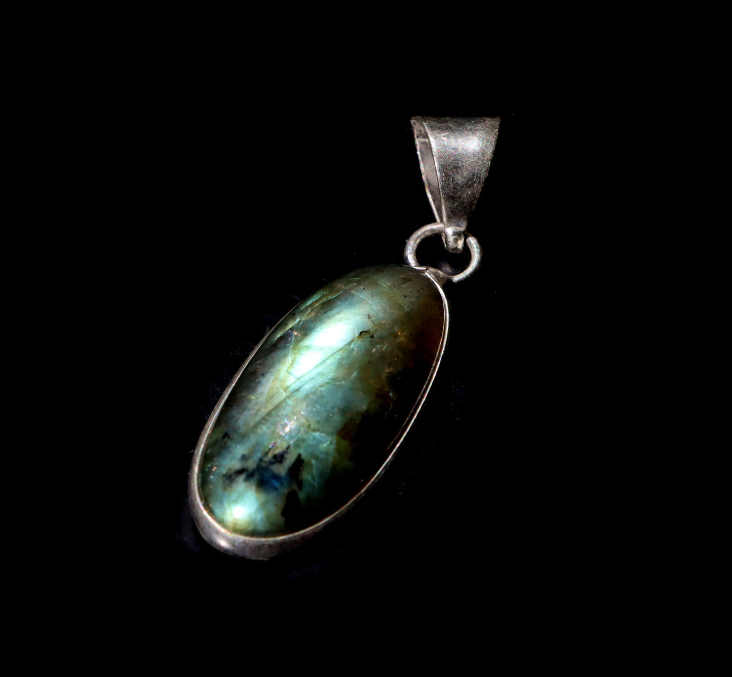 Decentní přívěsek z labradoritu s typickým duhovým leskem v odstínech modré a zelené. Kámen je spojován s ochranou, intuicí a posílením vnitřní síly. Skvělý jako nenápadný doplněk i osobní talisman.
