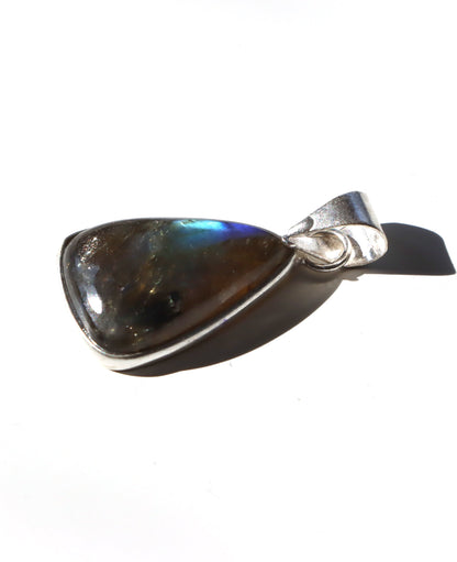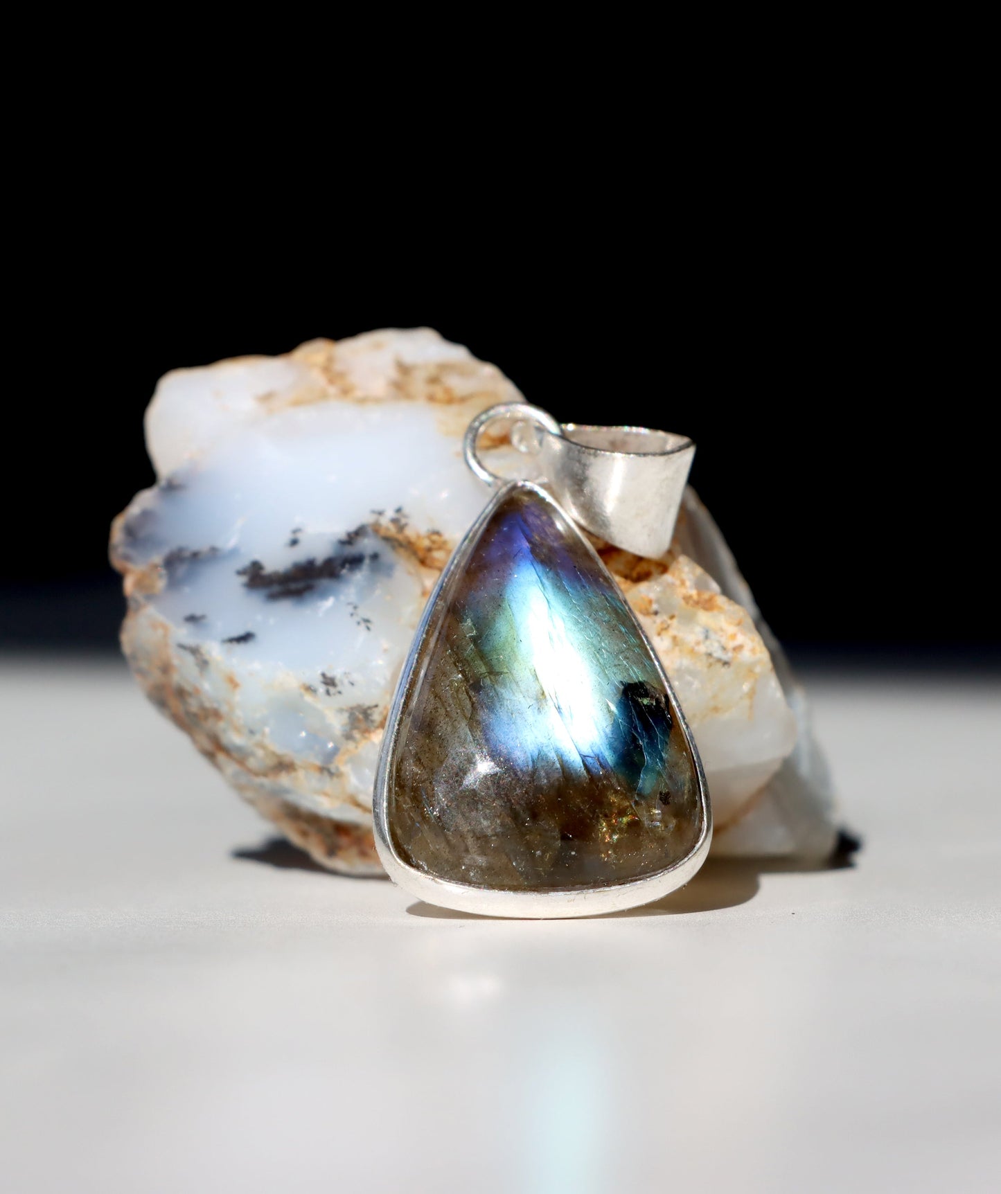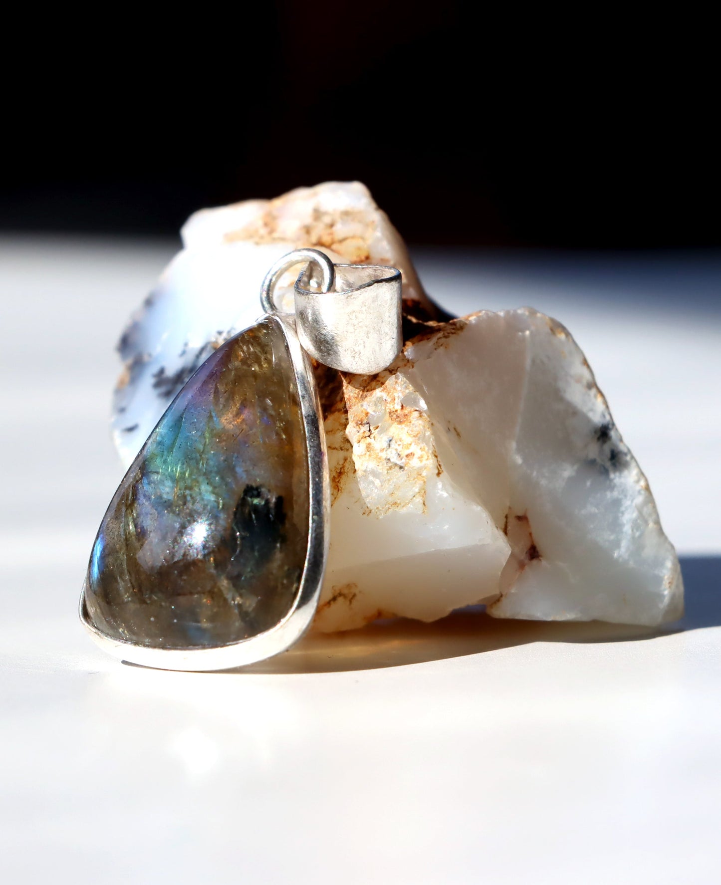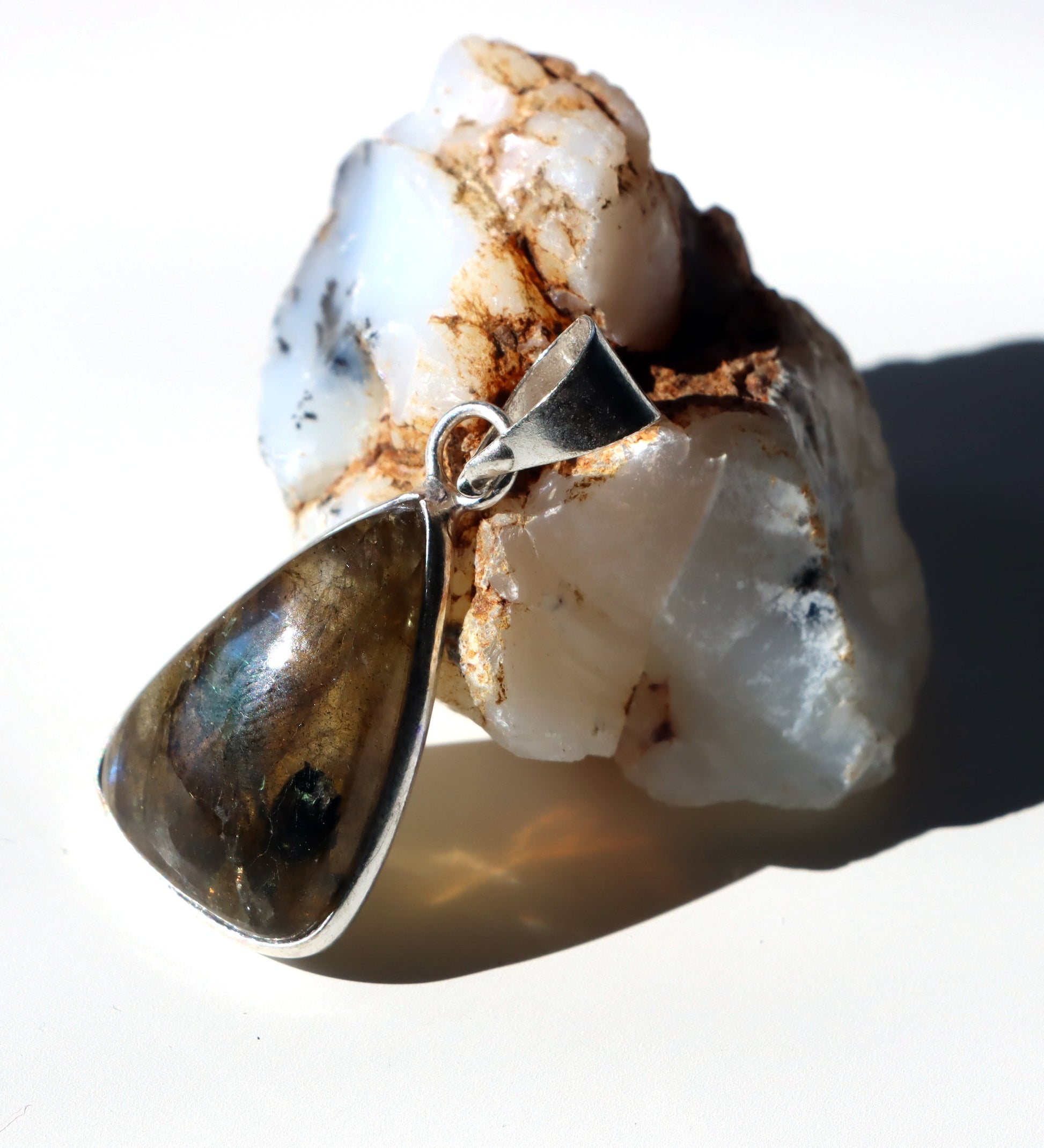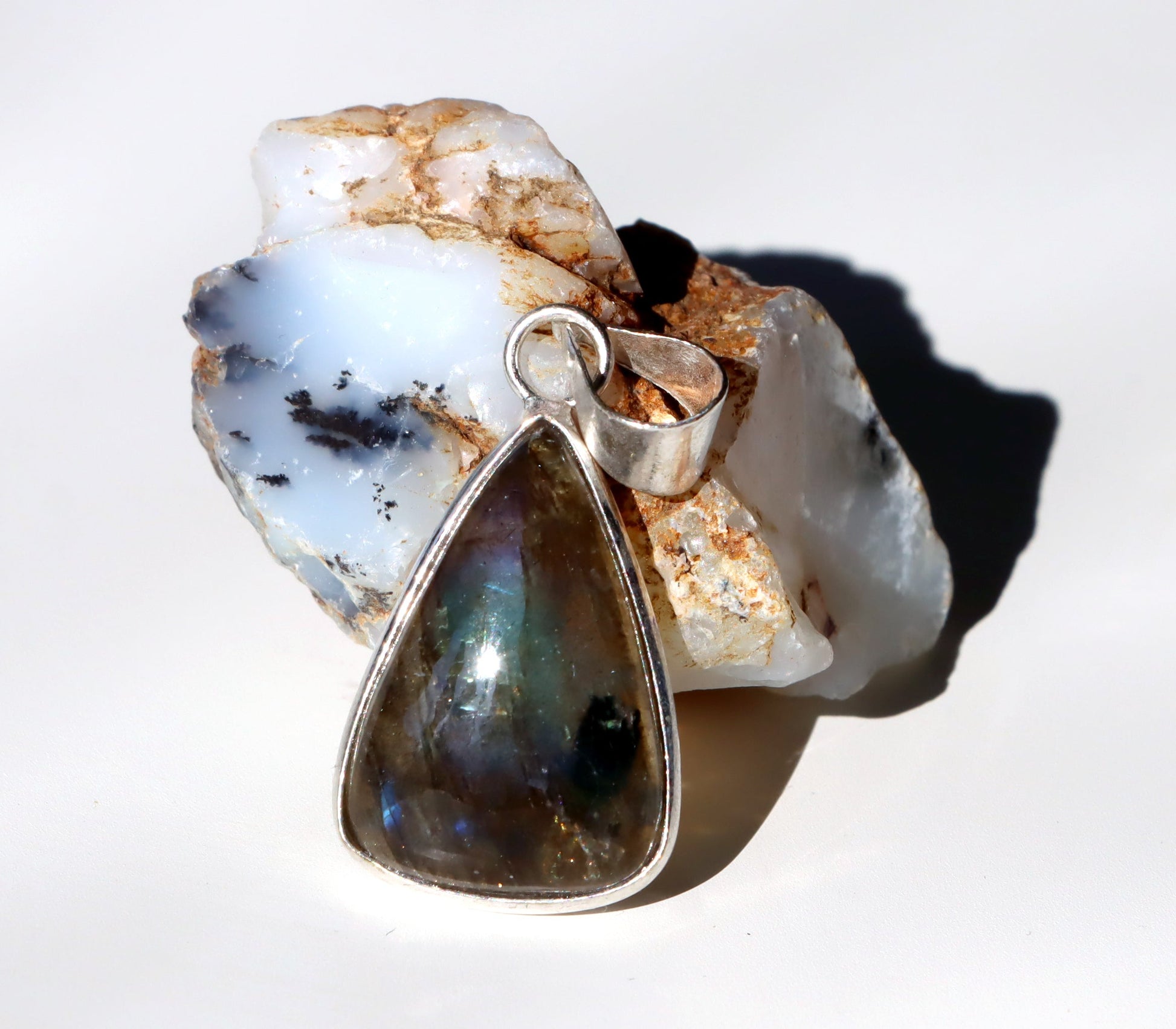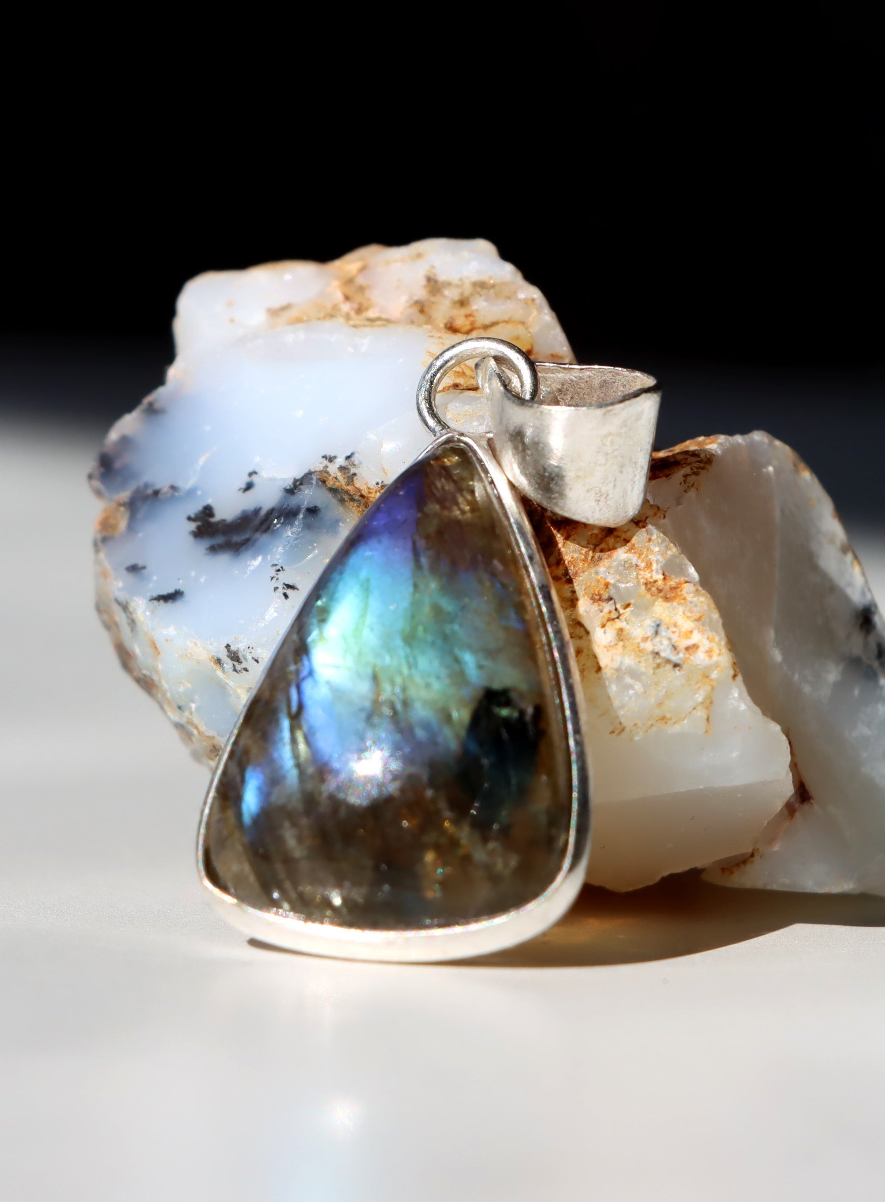 Decentní přívěsek z labradoritu s typickým duhovým leskem v odstínech modré a zelené. Kámen je spojován s ochranou, intuicí a posílením vnitřní síly. Skvělý jako nenápadný doplněk i osobní talisman.