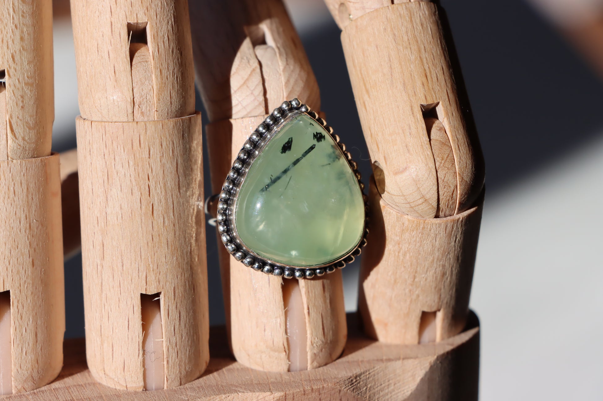 Prsten s epidotem v prehnitu upoutá svěží zelení s tmavšími inkluzemi, které vytvářejí originální přírodní kresbu. Jedinečné spojení minerálů dodává šperku harmonický a přírodní charakter.