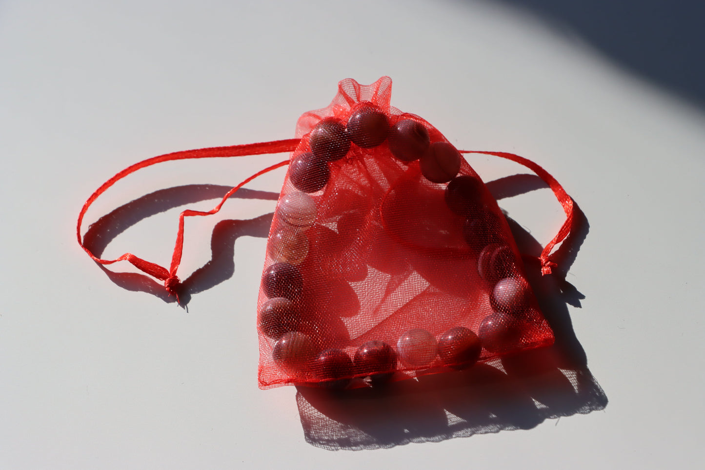 Elegantní červený průhledný dárkový pytlík – Výrazné a luxusní balení pro minerály, šperky nebo jiné drobné poklady. Průsvitná tkanina syté červené barvy působí sofistikovaně, zatímco stahovací šňůrka zajistí bezpečné uzavření. Perfektní volba pro dárkové balení s nádechem vášnivé elegance. ❤️✨