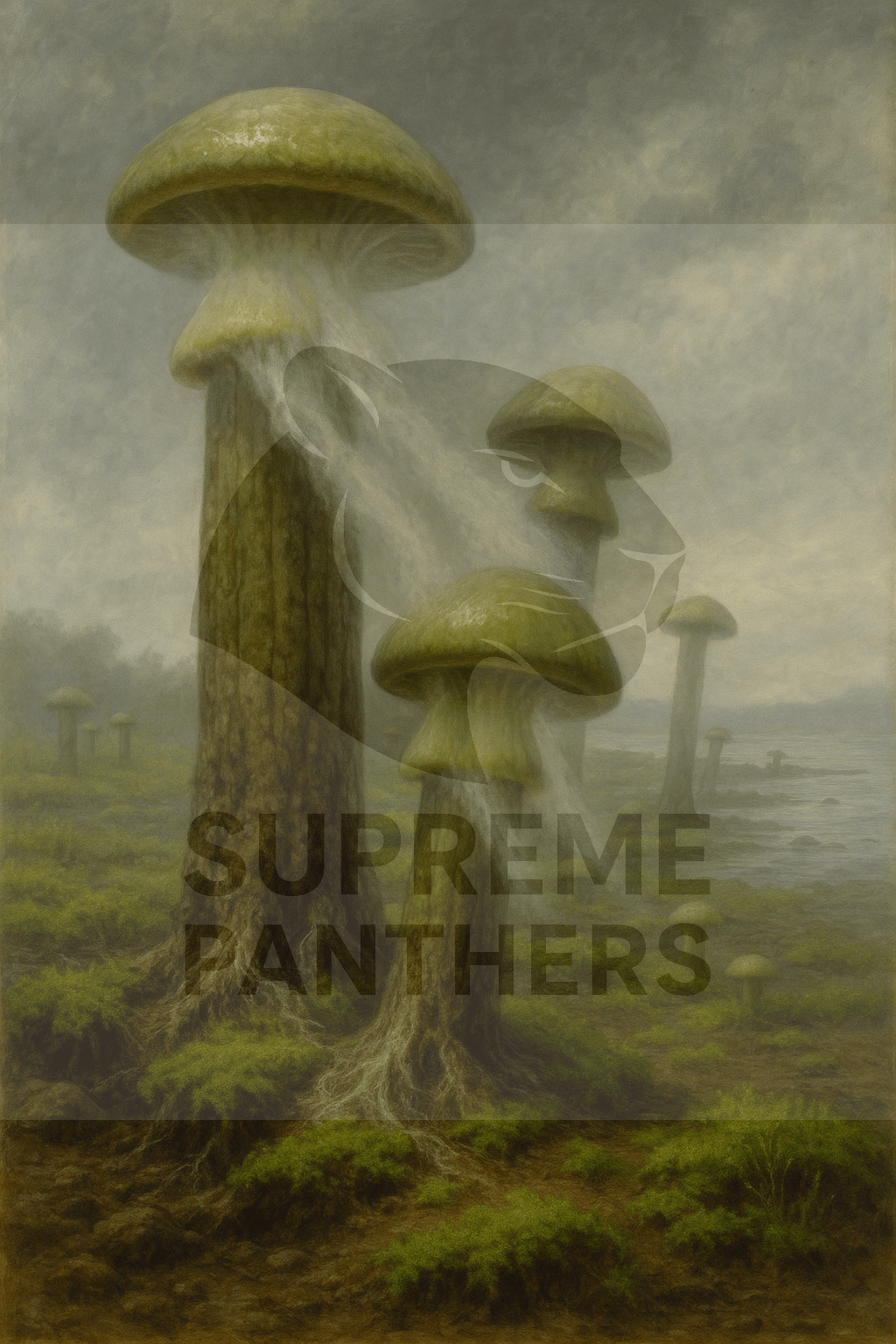Na spodní straně jejich mohutných klobouků se právě uvolňují jemné obláčky výtrusů (spor), které unáší vítr nad mlhou zahalenou krajinou. Povrch těchto útvarů působí živě a organicky – od drsných a ztvrdlých bází až po vláčnější, aktivně rostoucí vrchní části. Atmosféra výjevu je poklidná a snová, přesto však odkazuje na záhadnost a izolovanost dávného světa bez živočichů, který čekal na své první kolonizátory.