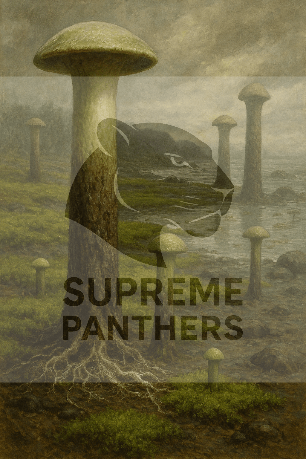 Rekonstrukce silurské krajiny s gigantickými houbami rodu Prototaxites (vlastní originální práce) Tento výjev zobrazuje prehistorickou krajinu v období siluru, přibližně před 420 miliony let, kdy se na souši objevily obří organismy rodu Prototaxites. Tyto monumentální útvary, dnes považované za pravděpodobné houby nebo lišejníky, mohly dorůstat výšky až 8 metrů. V době, kdy ještě neexistovaly stromy ani složité cévnaté rostliny, představovaly Prototaxites největší pozemské organismy. Scéna zachycuje jejich rozšíření na vlhkém pobřeží, mezi nízkou primitivní vegetací a mělkými mokřady, pod zataženou oblohou prastarého světa.