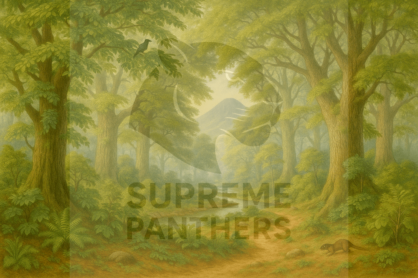 Scéna zachycuje subtropický listnatý les oblasti Zemplína v době středního miocénu, přibližně před 15 miliony let. Dominantními dřevinami jsou pralesní duby, příbuzné dnešnímu Quercus robur, doprovázené bohatým podrostem kapradin, raných krytosemenných keřů a lužních bylin. Na větvi sedí zástupce praptáků nebo raných pěvců, zatímco v popředí se pohybuje malý zástupce savců, snad předek dnešních lasicovitých. V pozadí se zvedá mladý sopečný kužel – symbol vulkanické aktivity, která formovala krajinu Zemplínských vrchů v období karpatské neotektoniky.
