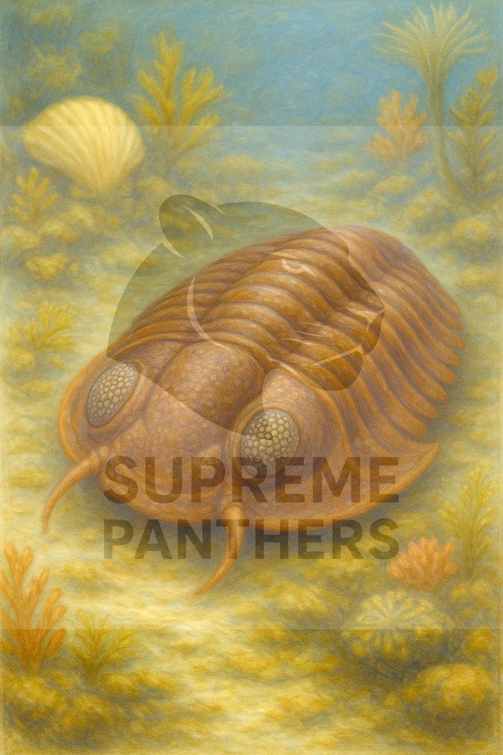 Rekonstrukce devonského mořského dna s trilobitem Phacops potierii (vlastní originální práce) Tato malířská rekonstrukce zachycuje podmořský život během období devonu, přibližně před 390 miliony let. V popředí dominuje trilobit Phacops potierii – zástupce skupiny phacopidních trilobitů, známý svými velkými, složenými čočkovitými očima a výrazně segmentovaným tělem. Tito trilobiti byli pomalými bentickými živočichy, kteří se pohybovali po mořském dně a živili se organickými zbytky nebo drobnými organismy.
