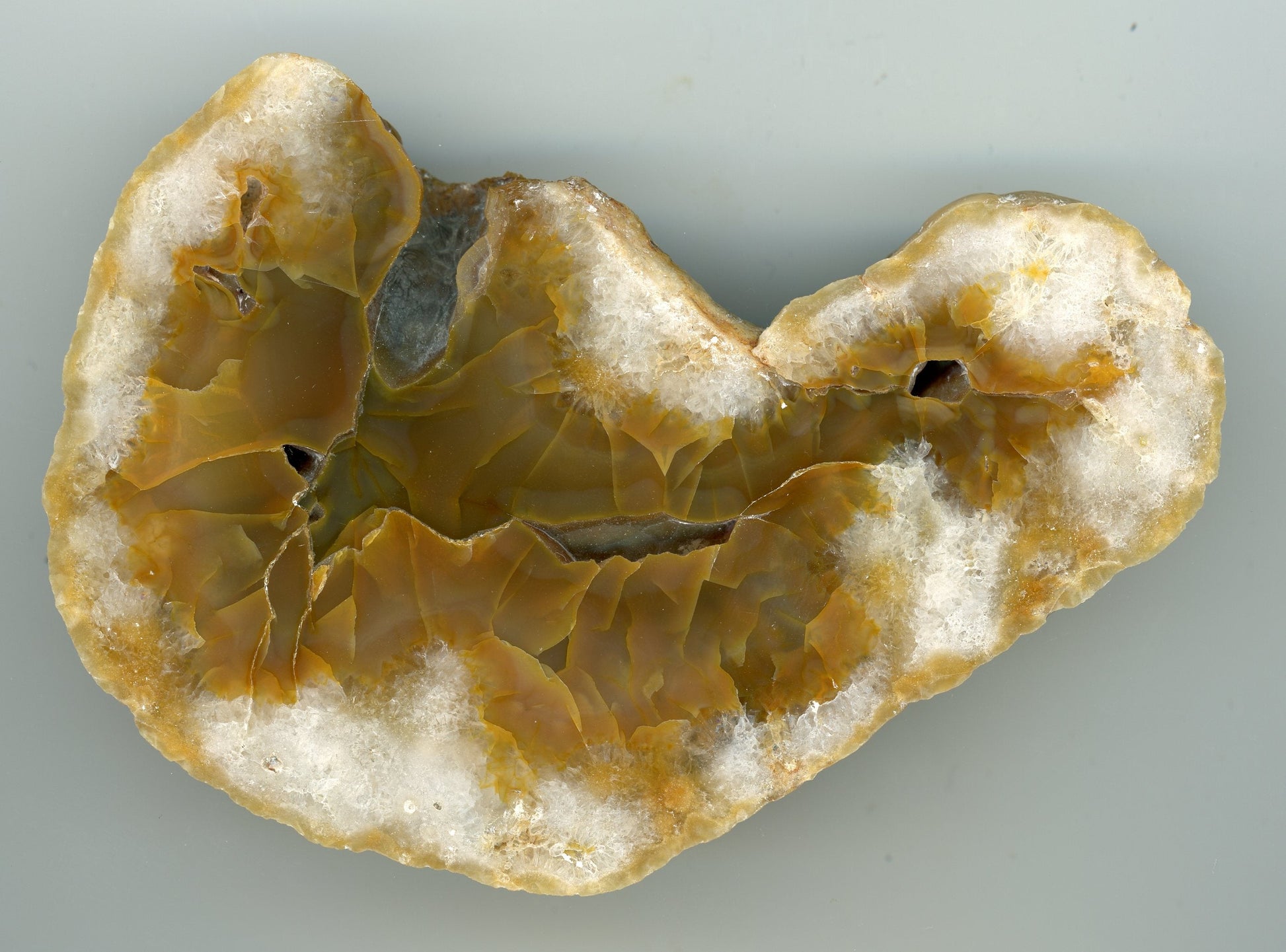 Leštěná rudická geoda vyplněná chalcedonem medové barvy.