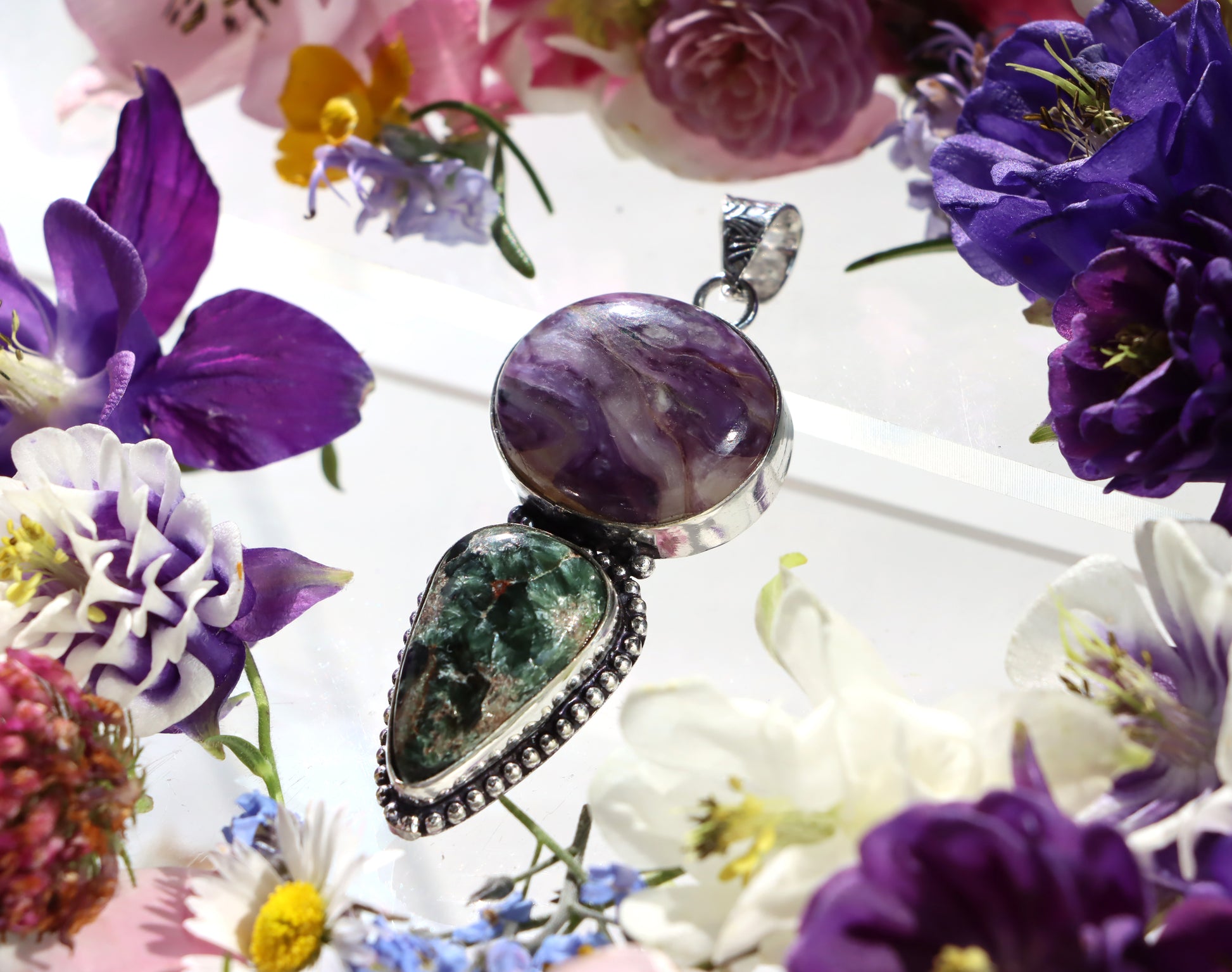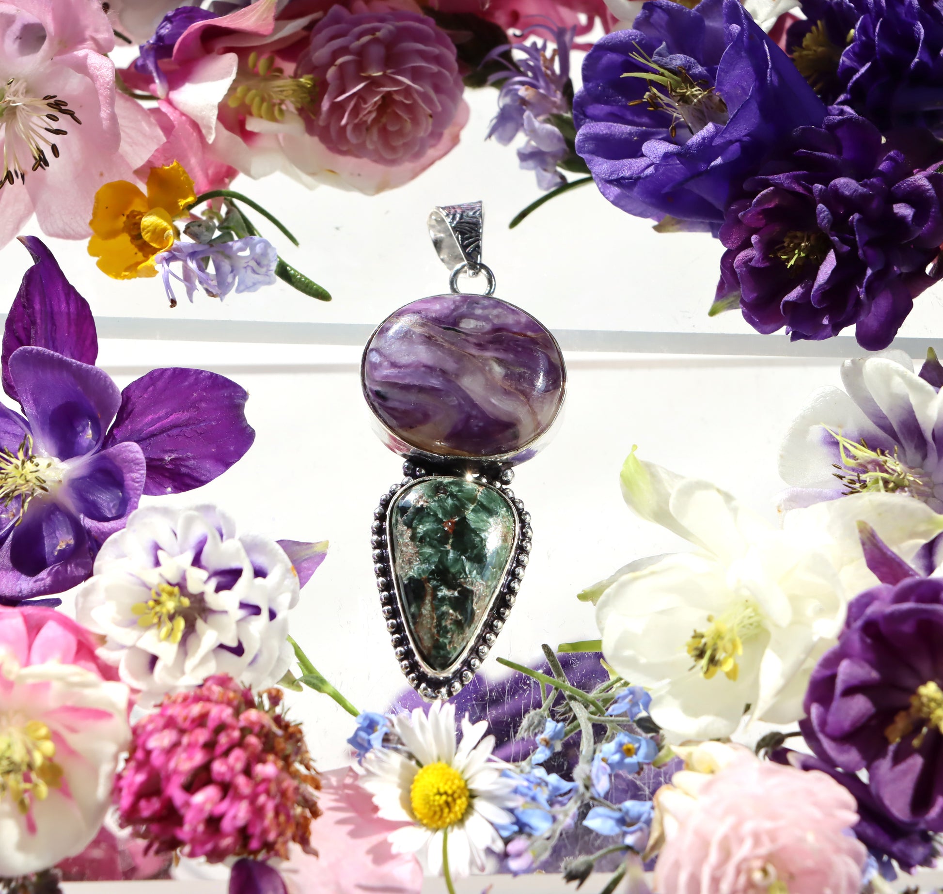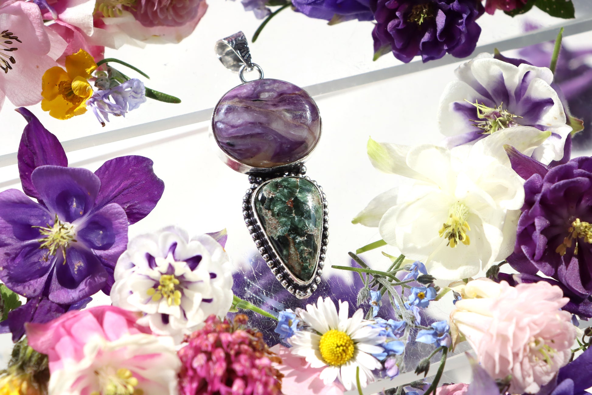 Kombinace serafinitu a charoitu vytváří silný amulet zaměřený na duchovní růst, léčení a hluboké sebepoznání. Serafinit je známý jako kámen andělské energie, který podporuje duchovní propojení, intuici a harmonii. Má očistné a léčivé vlastnosti, které napomáhají fyzickému i energetickému vyrovnání. Charoit je zase spojován s transformací, překonáváním strachů a přijetím změn. Pomáhá při hluboké duchovní práci a podporuje odvahu čelit životním výzvám. Společně tyto kameny přinášejí harmonii mezi duchovním uvědoměním, vnitřním klidem a silou zvládat proměny, zatímco podporují duchovní léčení a rozvoj intuice.
