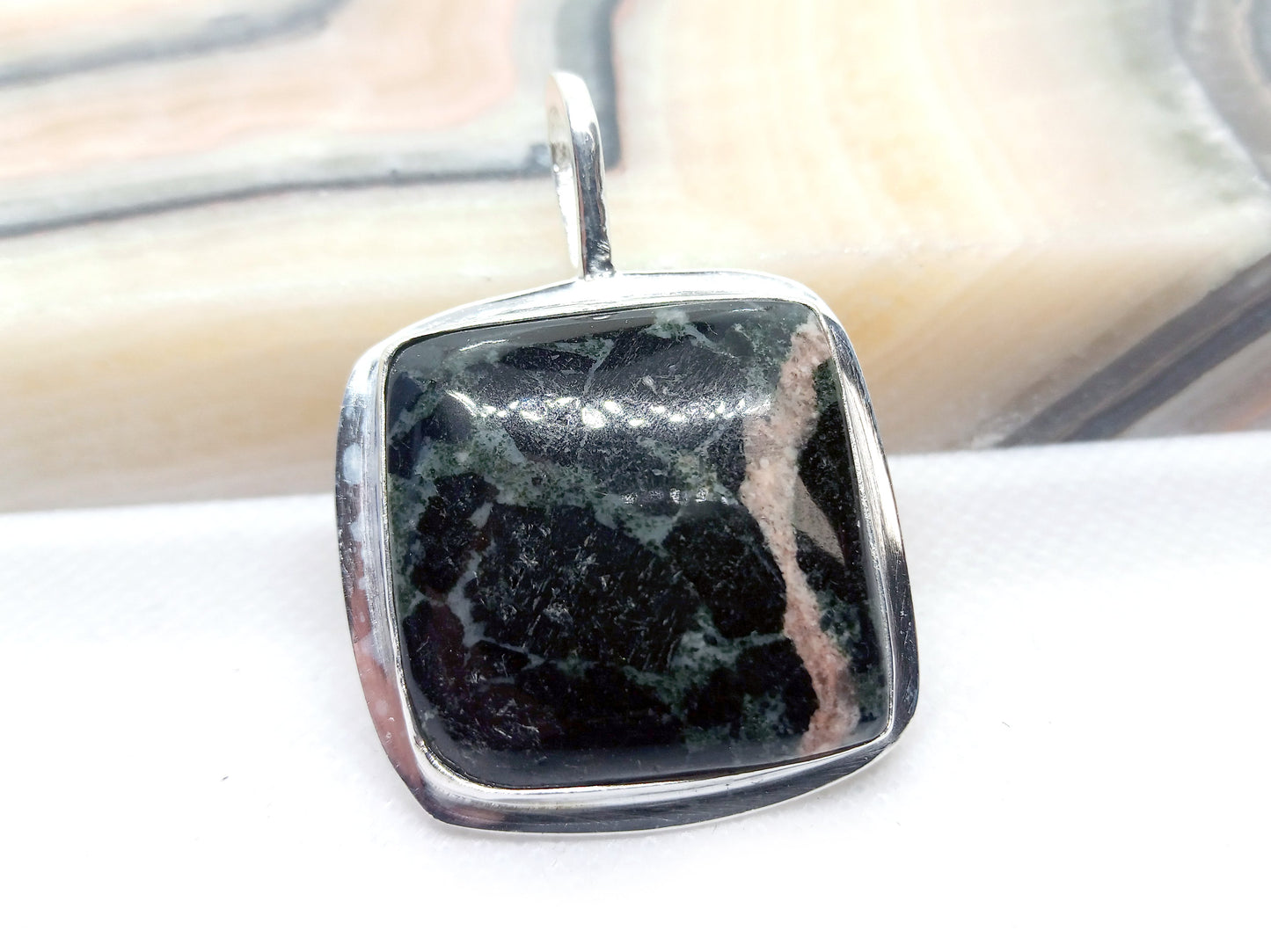 Broušený kabošon zasazený do postříbřeného kovu (měď nebo bronz). Ryzost stříbra je 925/1000.