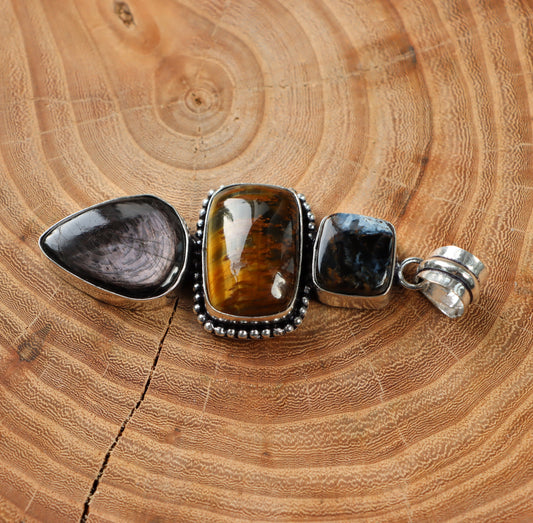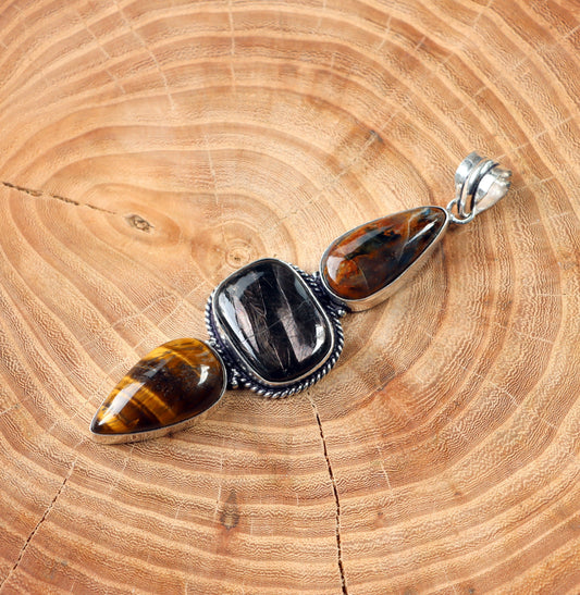 Amulet síly a duchovního propojení: Přívěsek Tygří oko, Hyperstén & Pietersite .Tento přívěsek spojuje energii tří silných minerálů, které podporují odvahu, stabilitu a duchovní vhled. Tygří oko, se svými zlatavými odlesky, poskytuje ochranu, uzemnění a dodává odvahu při překonávání výzev. Hyperstén, s jeho temnými a tajemnými tóny, pomáhá propojit mysl s duchovním světem, zklidňuje a přináší vnitřní vyrovnanost. Pietersite, známý jako "kámen bouří", podporuje intuici, osobní proměnu a duchovní růst. Společně tyto kameny tvoří amulet, který zajišťuje ochranu, duchovní propojení a sílu překonat jakékoliv překážky.