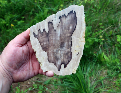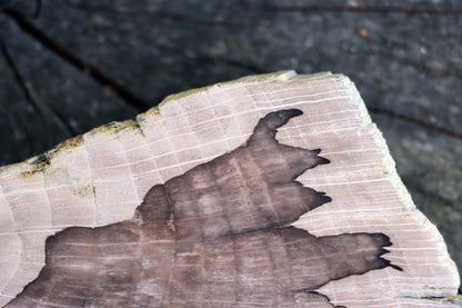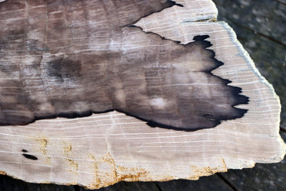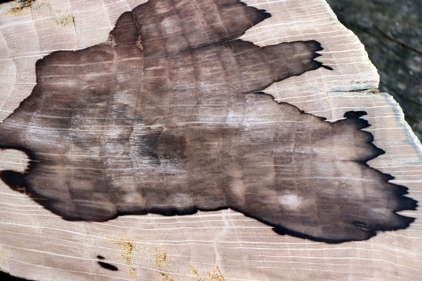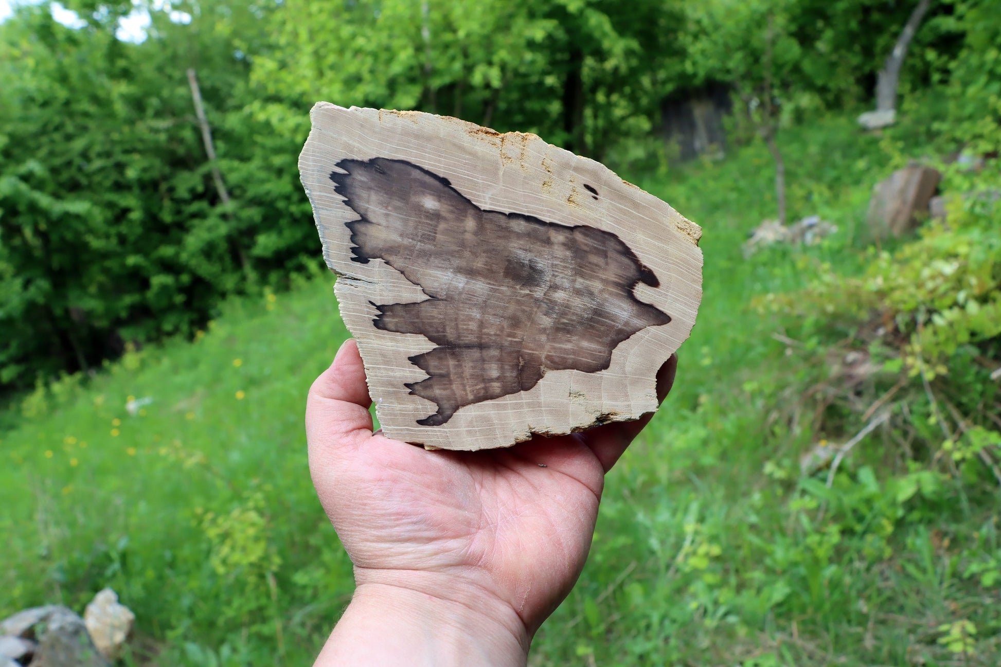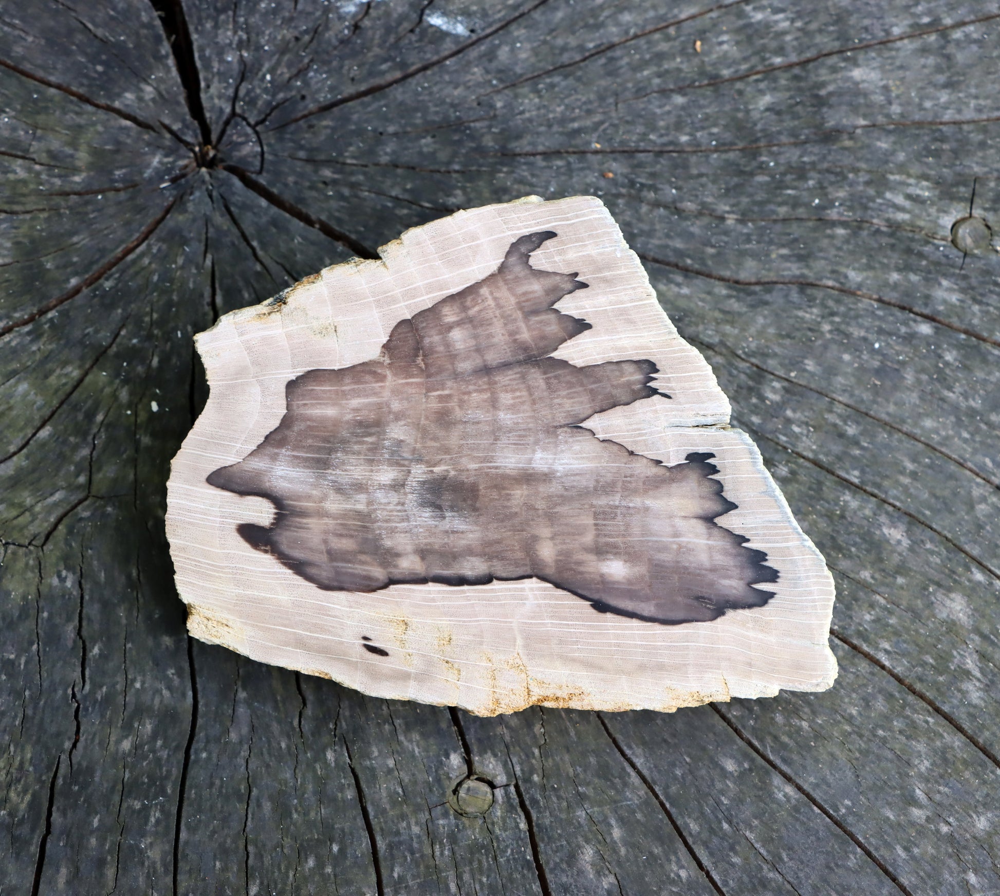 Fosilizované dřevo s kresbou po houbové infekci Tento řez fosilního dřeva zaujme nápadnou kresbou tmavých pigmentových zón, které vznikly prorůstáním dřevokazné houby ještě za života stromu nebo krátce po jeho odumření. Houba v cévním systému zanechala výraznou stopu, která se díky fosilizačním procesům uchovala v podobě kontrastní černohnědé kresby. Přirozené linie a tvar vytvářejí téměř obrazový motiv – důkaz spolupráce času, rozkladu a zachování.